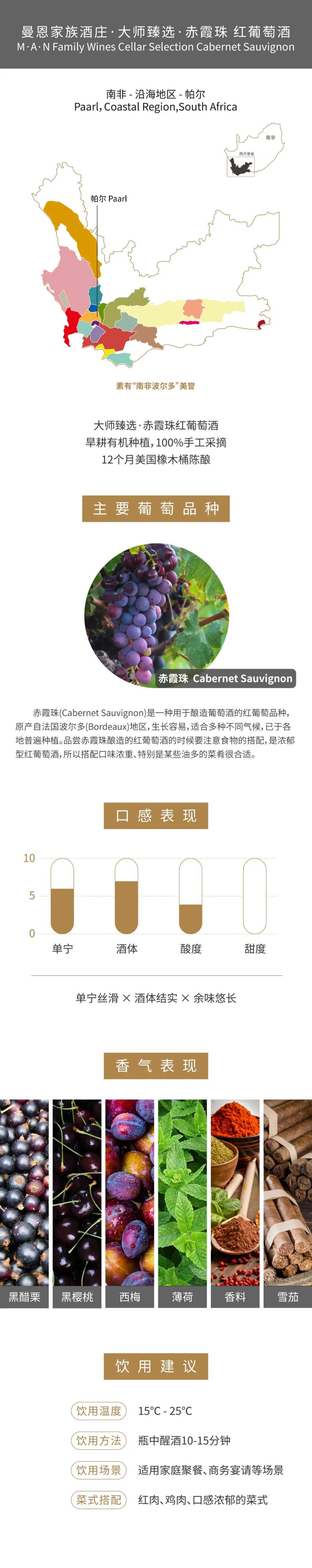 酿造工艺:手工采摘,12个月美国橡木桶陈酿