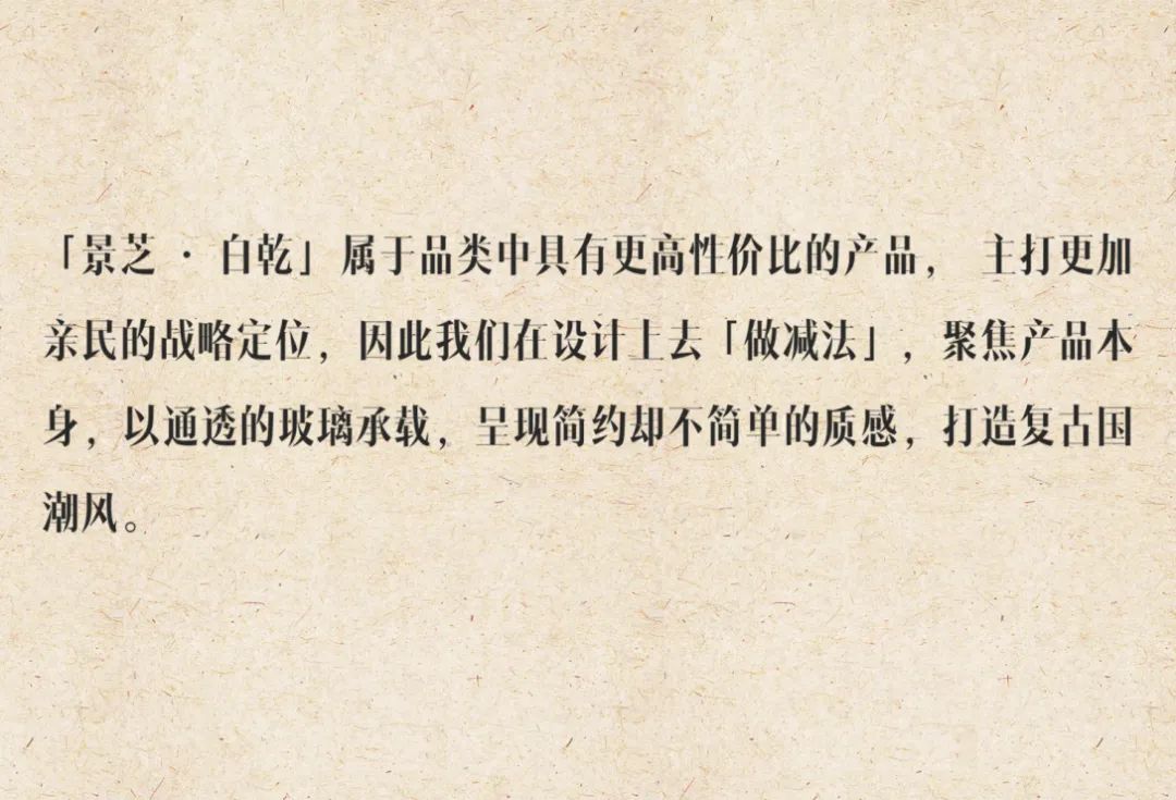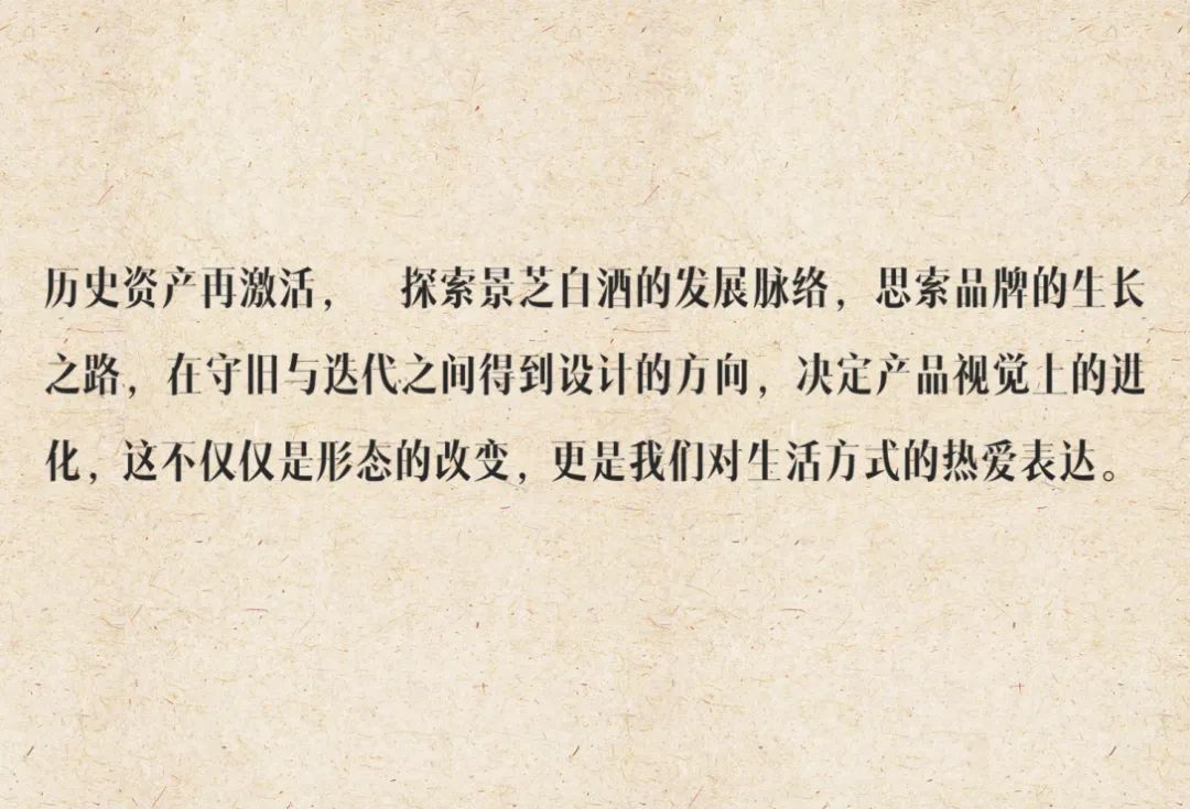 历史资产再激活, 探索景芝白酒的发展脉络,思索品牌的生长之路,在守旧与迭代之间得到设计的方向,决定产品视觉上的进化,这不仅仅是形态的改变,更是我们对生活方式的热爱表达。