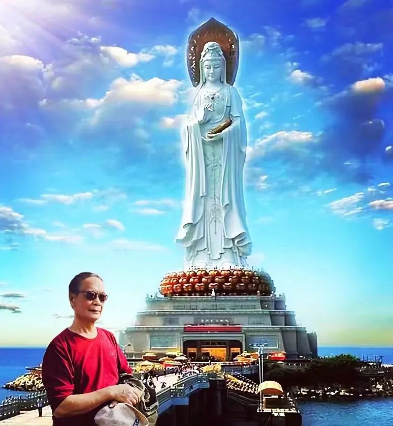 南海观音巨像,如定海神针,脚蹈海浪,头顶青天,镇惊涛,却骇浪,矗立在海之南,高耸于海天间。