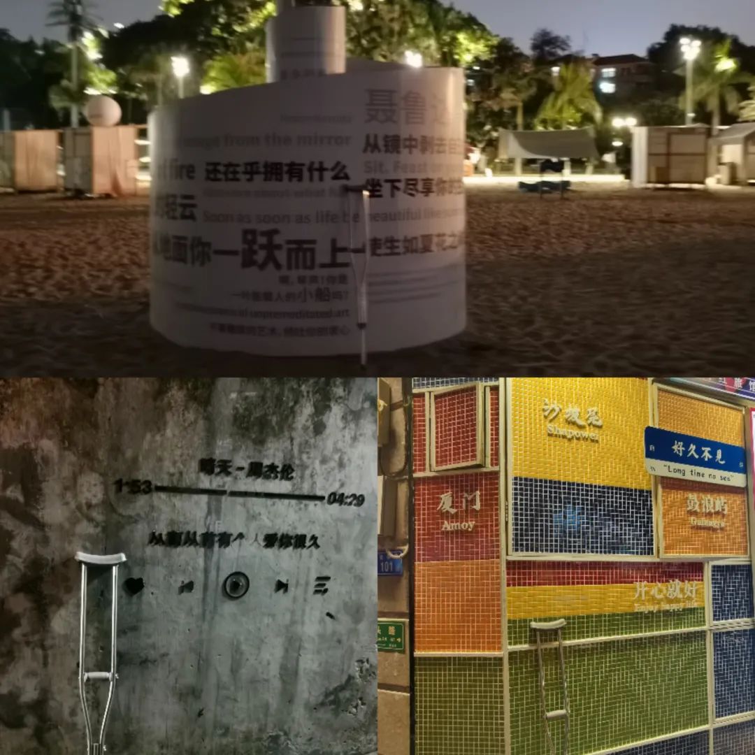 下午和晚上,是我最期待的沙坡尾摄影和环岛路骑行。这是我心之所向的体验。但是本来并不是很远的路程,却在五一期间遥不可及。厦门明明是个大城市,可是很多马路却远比想象当中的窄。五一期间人流量、车流量陡然增大,这些小小的车道显然满足不了需求。我们这些骑自行车的,已经被迫骑上了人行道,但是游客众多,人头攒动,我们寸步难移(堵自行车听说过吗!)。再加上道路不平,突然上坡突然下坡路段很多,简直令人抓狂。可是一心向往的风景就在前方啊,我为了要看到那些我不曾见过一次的地方,现在这又算什么呢?心里的那个信仰在那,咬咬牙,就过去了。我的好兄弟在过了一个马路之后跟我说,他放弃了,不想去了,他没我那样的执念,而且长时间的拥堵已经令他烦躁不安,他没法再勉强自己了。他离开之后,我恰好想起一个在厦门大学的同学,正是去年去广州时在长治东站碰见的那个同学,直接几句话喊出来,让他带着我在沙坡尾尽情拍意境夕阳,拍风情建筑。有了半个本地人带路,游玩起来果然轻松多了。接下来就是期待已久的环岛路骑行。吹着海风,漫无目的地骑车一定很自由、很浪漫吧。不过到了才发现,好像如果下午来,能看得见夕阳,能看得见海,效果会更好,晚上才到,好像真的只能吹海风了。再加上一路上有相当多也相当长的上坡路段,共享单车可以骑到满腿充满乳酸。最终我们停在了黄厝海滩,我又一次扔下拐杖,这次又脱掉了鞋和袜子,踩着沙滩直奔海边而去。布满淤血的右脚和肿胀的右脚踝,在被海水浸湿的那一刻,好像都不存在了。上一次见海是2018年的山东威海,那是北方的海。南方的海,这是第一次没过我的脚踝,拍打在我身上。洗涤,流淌,丝滑,冰凉,暂时冲走了心中的不爽。凝视夜晚海的黑暗与深邃,一片又一片的浪拍打在腿上,不禁幻想若此时被海水卷走,没有人看得到,没有人会发现,我将会在无尽黑暗中漂流,最终沉入更大更深的黑暗中。罢了,就不乱想多想,闭上眼,狠吸两口海风,任凭这海水再肆意拍打,放纵自己享受自由的模样。