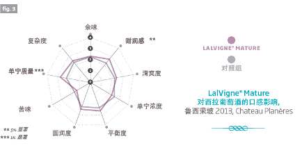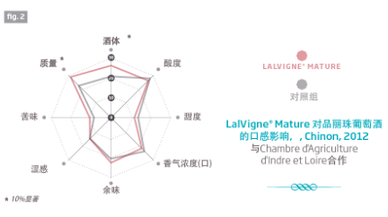 在这些条件下,技术成熟度(糖、酸等)会很快达到,而酚类成熟尚未达到,如果等待最佳酚类成熟度,则会对葡萄和最终的酒液产生产生负面影响:潜在酒精强度增加,酸度降低,香气前体的数量减少。在这种情况下,LalVigne™ Mature可以将收获日期提前从而限制上述影响,或在同样的采收日期下得到更具有结构感且整体更平衡的葡萄酒。酿造出的葡萄酒具有更加结实细腻的单宁和更多的酒体和圆润度,而灼感和苦涩度明显减少,为葡萄酒带来更多的平衡和更愉悦的口感。