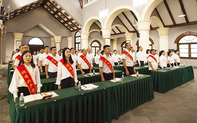 “七一”表扬大会在雄伟的国歌中拉开帷幕,集团党委书记、董事长王洪禹带领全体党员面向鲜红的党旗重温入党誓词。
