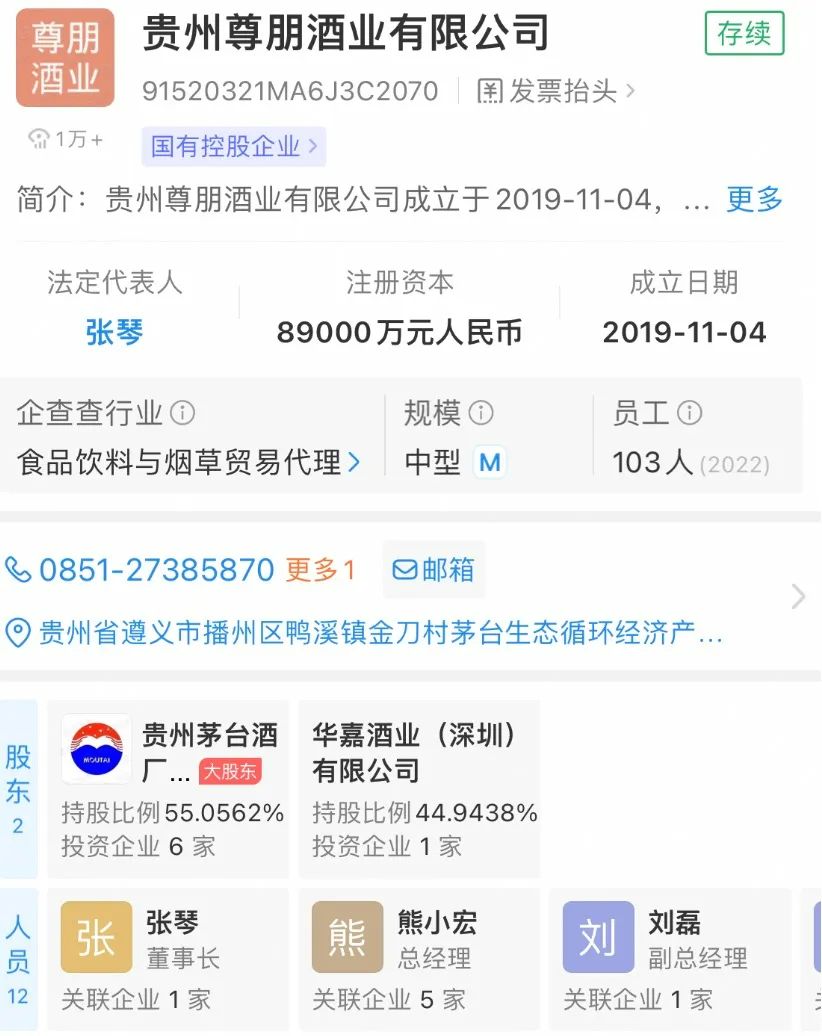 值得注意的是,尊朋酒业与茅台集团旗下子公司有着密不可分的关系。根据工商注册信息,尊朋酒业成立于2019年,其注册资本8.9亿元,其中华嘉酒业出资4亿元,茅台集团全资子公司贵州茅台酒厂集团循环经济产业投资开发有限公司出资4.9亿元。时任茅台集团党委书记、董事长李保芳,茅台集团党委副书记、总经理李静仁等人都曾参与尊朋酒业的揭牌仪式。