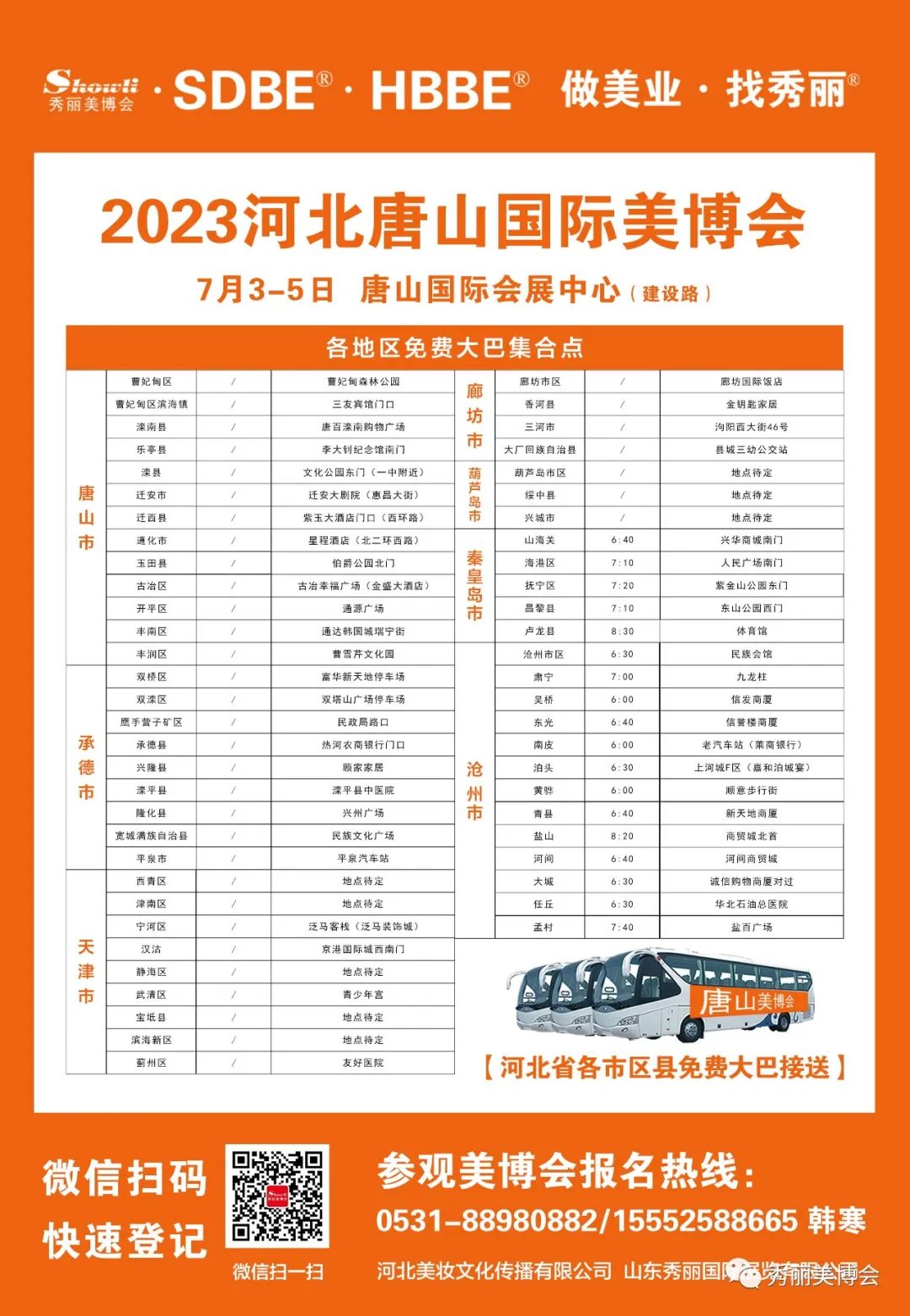 2023河北唐山国际美博会很快将与大家相见,为了更好地服务美业门店,本届美博会在以下站点提供“专业观众大巴车接送”服务,抓紧时间预约吧!