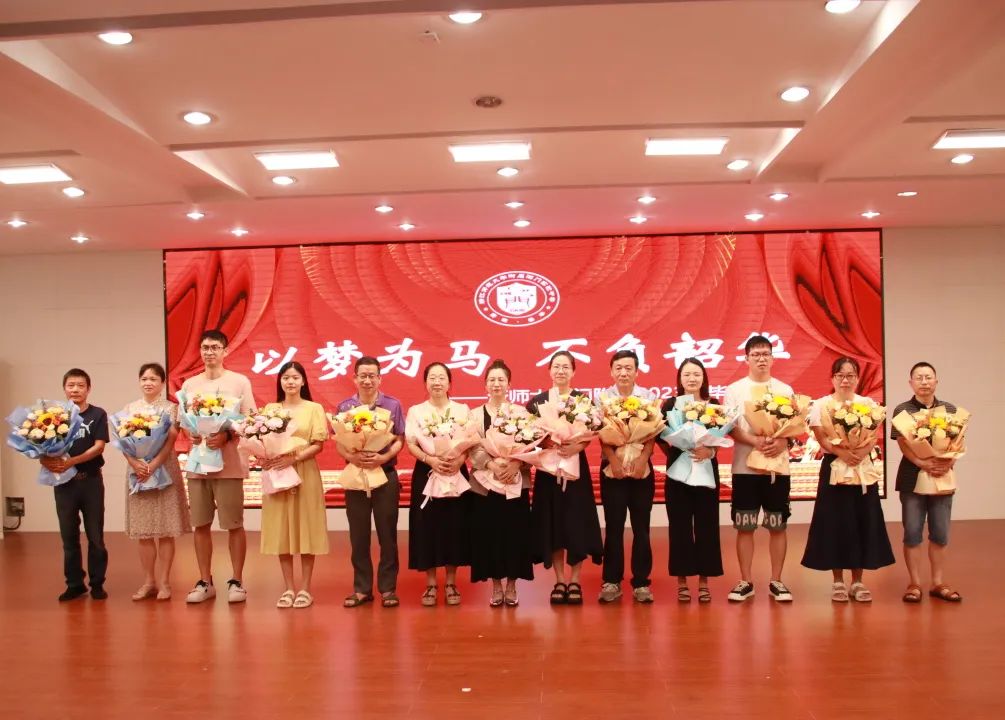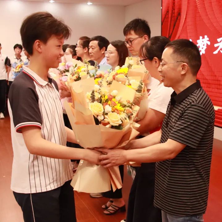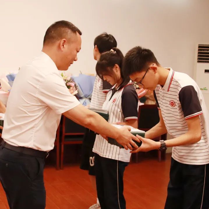 师恩绵绵,桃花灼灼。学生代表为各班主任老师送上鲜花,穿越奋斗的时空,感谢成长路上老师们相授相知、相悦相长。13位班主任也把最美的祝福送给远行的学子:追风赶月莫停留,平芜尽处是春山,怀揣梦想,踏浪前行,远行不怠,静续灿烂。师情漫漫,全场浩荡。分会场的老师也被请上台,全体九年级学生起立行鞠躬礼,向尽善尽责尽心的老师们致以崇高的敬意,感谢老师们的悉心栽培,感恩母校的浓情守护,才画下自己人生旅途中浓墨重彩的胜利一笔。