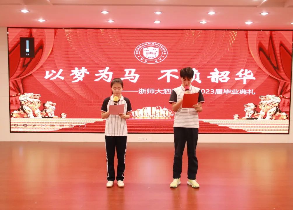 时光荏苒,春夏历复,感恩相遇,三年伴读,仲夏离别,情怀依依。7月1日上午,浙江师范大学附属泗门实验中学隆重举行“以梦为马 不负韶华”2023届毕业典礼。李凌云校长、邵晓炯副书记、方红敏副校长和诸国生副校长等全体行政人员、九年级班主任和各班学生代表齐聚五楼报告厅主会场,其余师生在各教室分会场观看直播盛况,共享毕业典礼的幸福时刻。本次典礼由909班黄杰、913班洪钇婷主持。