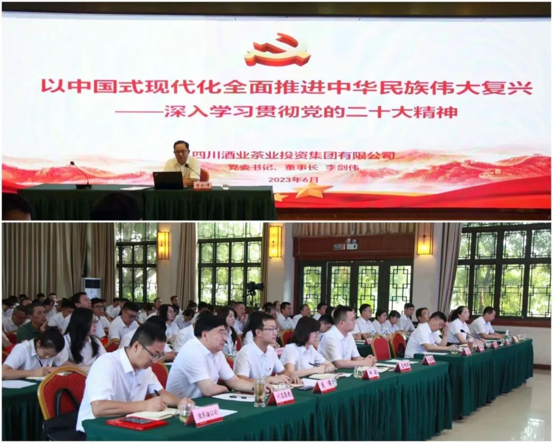 6月26日,集团公司党委书记李剑伟为全体党员讲授《以中国式现代化全面推进中华民族伟大复兴——深入学习贯彻党的二十大精神》专题党课,从中国共产党近年来取得的成就、使命任务、时代要求等五个方面进行了生动、全面的讲解,并号召全体党员要坚持以习近平新时代中国特色社会主义思想为指导,深入学习贯彻党的二十大精神和习近平总书记来川来宜重要指示精神,实施“旗帜引领、人才双驱、堡垒领先、红色引擎、同守初心、酒茶清风”党建六大行动,以高质量党建引领企业高质量发展。
