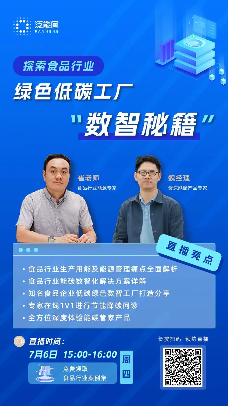 当绿色低碳发展理念成为社会共识,节能减碳比以往任何时候都要迫切。尤其是食品等对能源消耗与碳排放有明确严苛要求的行业,正在面临着一场来势凶猛的绿色大考!对于食品行业而言,在这场大考中有一道必答题,那便是如何实现用能更高效、更绿色?当下,食品行业的用能普遍面临着能源消耗量大、供需不匹配、能源精准管控难、相关人员效率低等棘手问题,阻碍着整个行业的绿色低碳发展。那么,食品行业要如何突破桎梏,实现能源使用和管理的质变升级?又如何在“双碳”目标下,找到可持续的“节能减碳”之道?又有哪些样本值得借鉴与学习?7月6日,泛能网将在线上举办探索食品行业绿色低碳工厂的“数智秘籍”直播,泛能网能碳专家亲自讲述数智技术在食品行业节能减碳中的探索与应用,并全景分享食品行业低碳智慧工厂案例,干货满满,精彩不容错过!扫码报名 预约直播↓