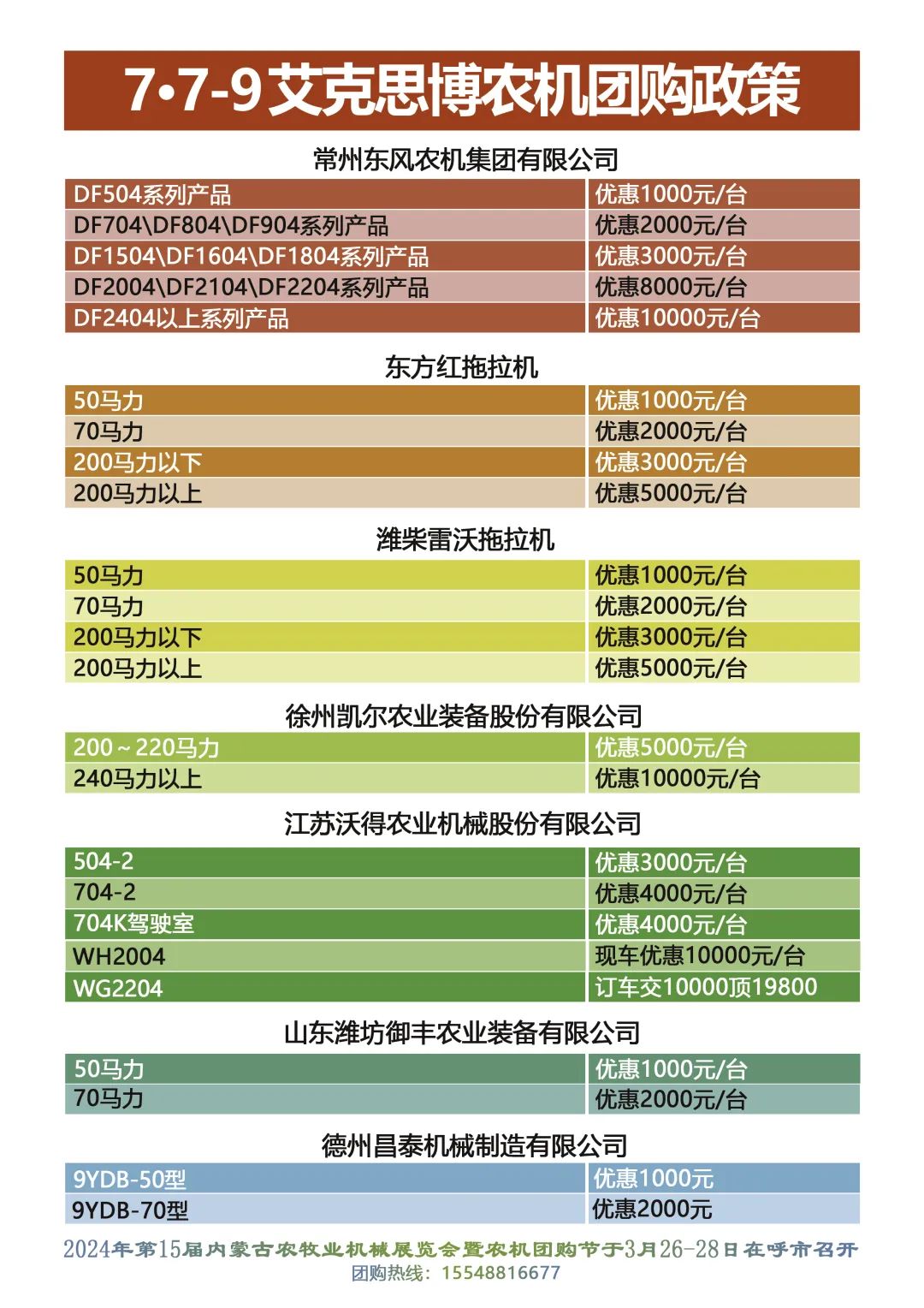 世界500强农机企业连续十四年参展本展,中机美诺、潍柴雷沃、约翰迪尔、中国一拖、常州东风、凯斯纽荷兰、山东思代尔、徐州凯尔、山东巨明等国内外知名企业携2023年新款机型亮相本次展会,集中展示:拖拉机、收获机、马铃薯机械、畜牧机械、奶业机械、饲料饲草机械、植保机械、无人机、北斗导航、大豆玉米复合种植机械等。展示及团购千台农机具,内蒙古地区农牧民现场团购将享受1000—80000元优惠政策,经过十四年的持续打造和创新,已成为中国最具影响力的农机行业盛会之一,内蒙古农牧民放心团购农机平台。