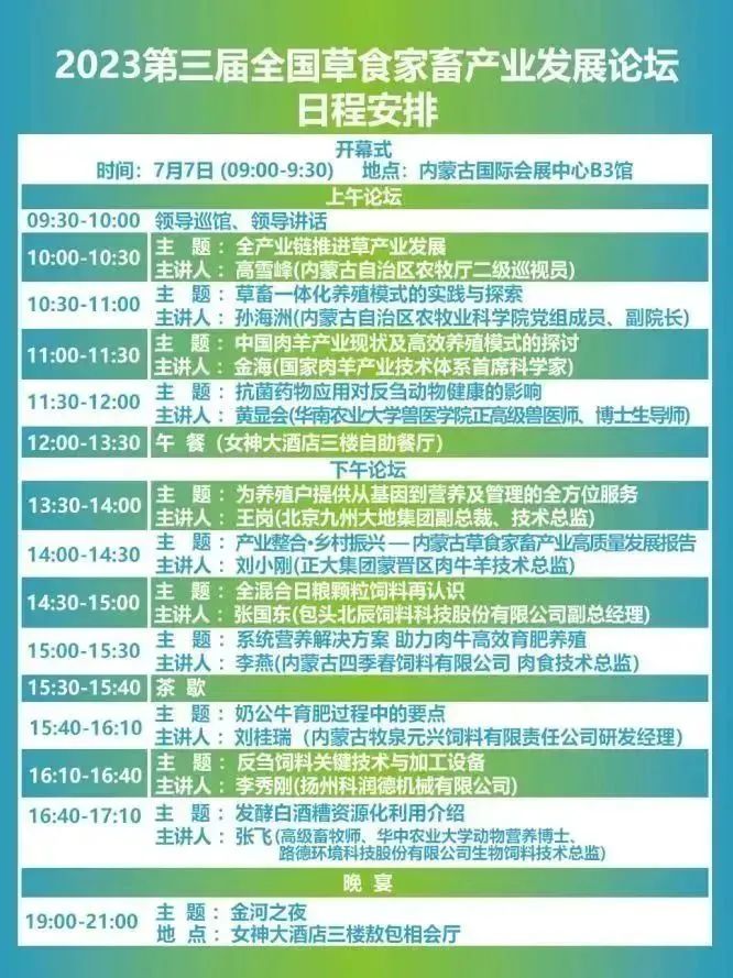 同期召开2023第三届全国草食家畜产业发展论坛,论坛主题主要围绕:草食家畜产业高质量发展、草产业发展、肉羊产业现状及高效养殖、抗菌药物的应用、肉牛高效育肥养殖、奶公牛育肥、反刍饲料关键技术与加工设备、白酒糟资源化利用,为养殖户提供从基因到营养及管理的全方位服务等主题分享。