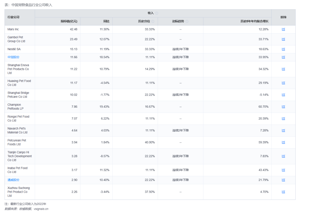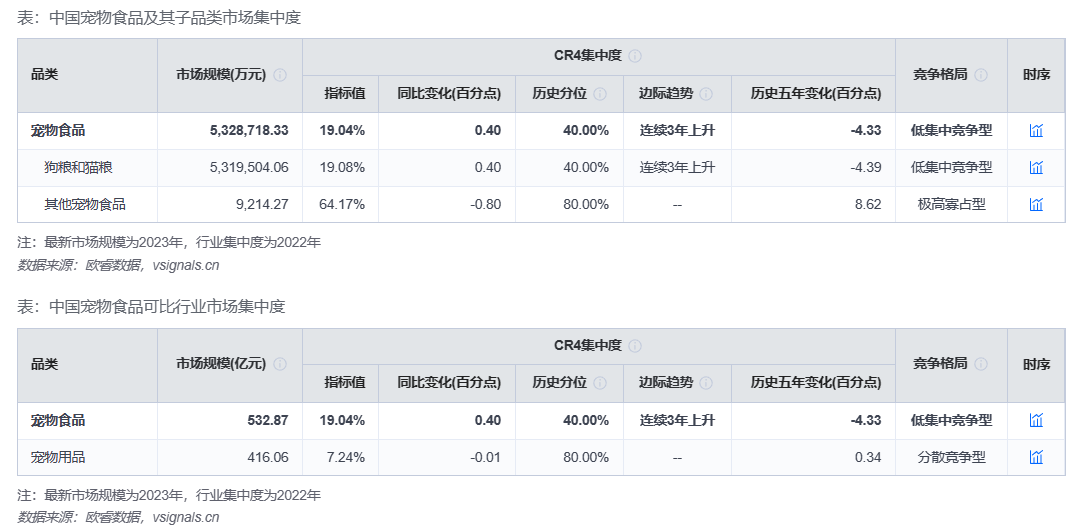 VSignals行业竞争格局报告通过分析行业竞争格局演变趋势,揭示行业内公司市场份额和长期竞争力。本文以宠物食品行业为例,VSignals显示行业集中度较低,2022年CR4达到19.04%,同比提升0.40个百分点。相关A股标的包括中宠股份、佩蒂股份、天元宠物、路斯股份等。以下为报告正文部分展示:
