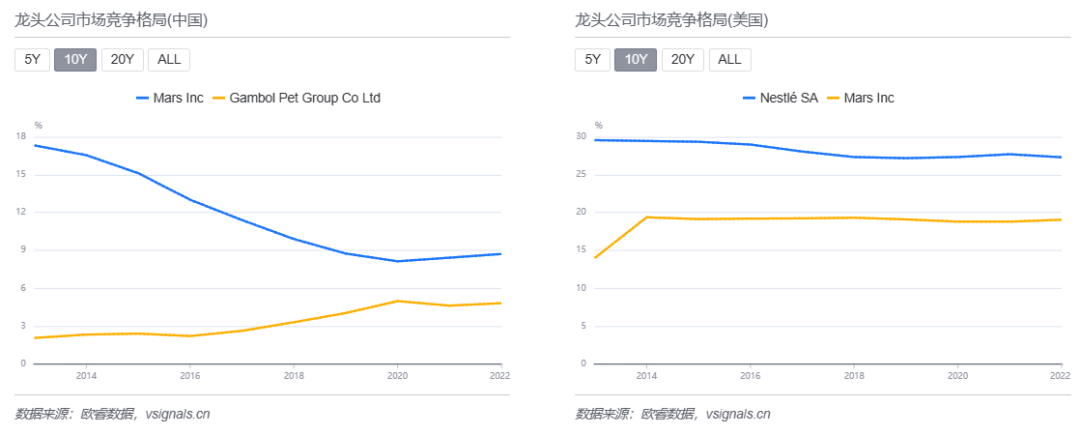 而在美国市场,2022年宠物食品行业市占率第一的龙头公司达到27.30%,领先市占率第二的龙头公司达到8.24个百分点,领先优势缩小0.57个百分点。