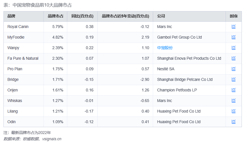 品牌集中度提升慢:2017~2022年前四大品牌集中度提升0.24个百分点,其中MyFoodie、Wanpy、Fa Pure & Natural等品牌集中度分别提升2.19个百分点、1.10个百分点、1.07个百分点,Royal Canin品牌市占率有所下降,分别下降0.12个百分点。