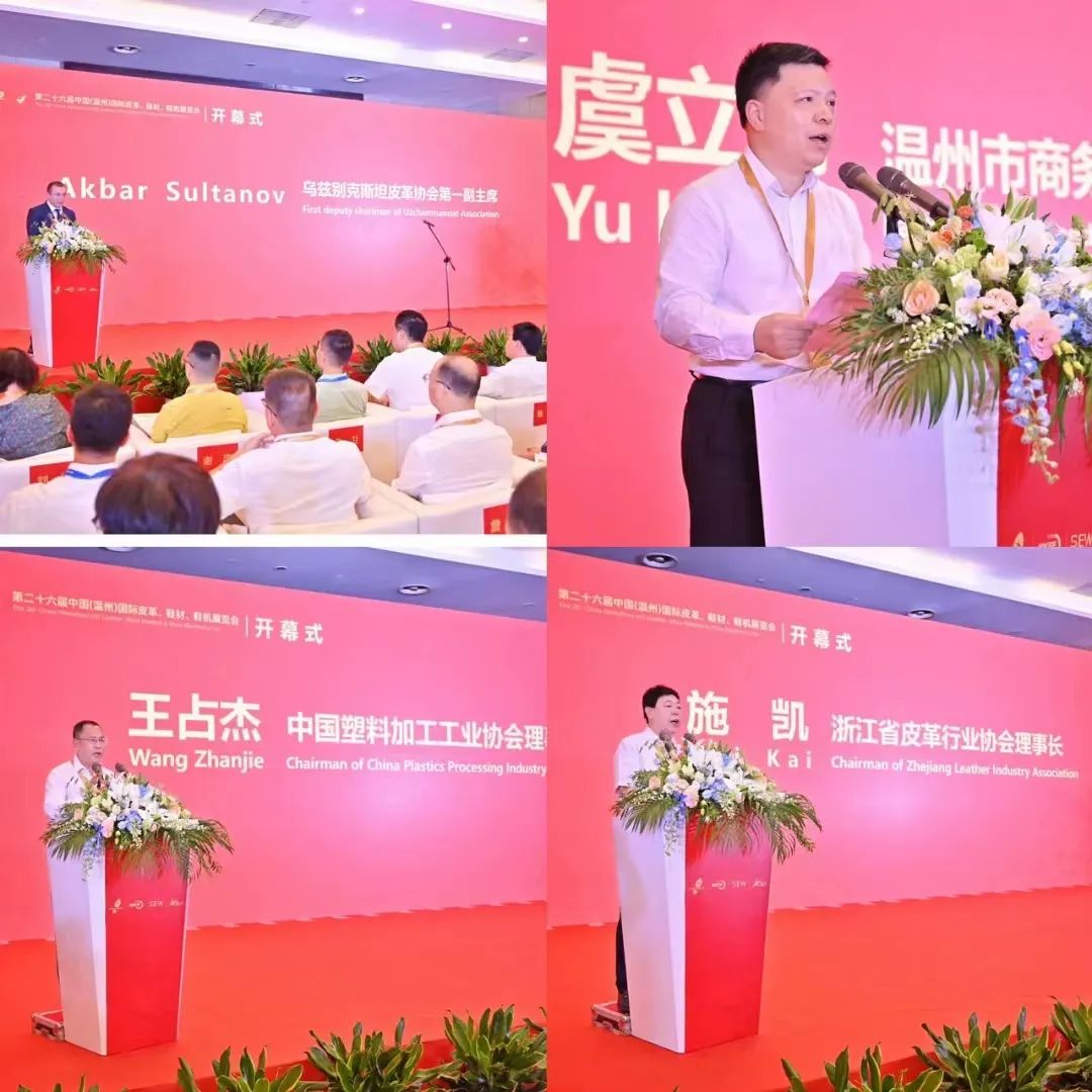 展会开幕式上,市商务局党组书记、局长虞立清致欢迎词,乌兹别克斯坦皮革协会第一副主席Akbar Sultanov代表主宾国——乌兹别克斯坦致辞,浙江省皮革行业协会理事长施凯、中国塑料加工工业协会理事长王占杰代表组委会致辞。温州市人民政府副市长王振勇出席并宣布展会开幕。