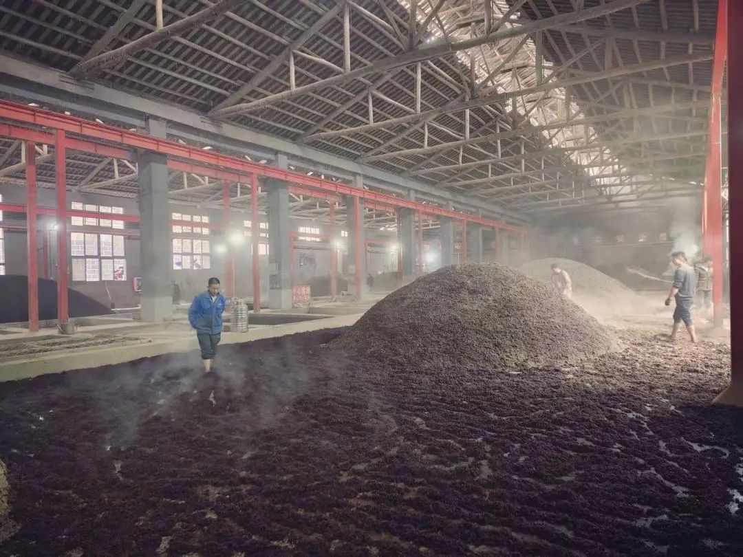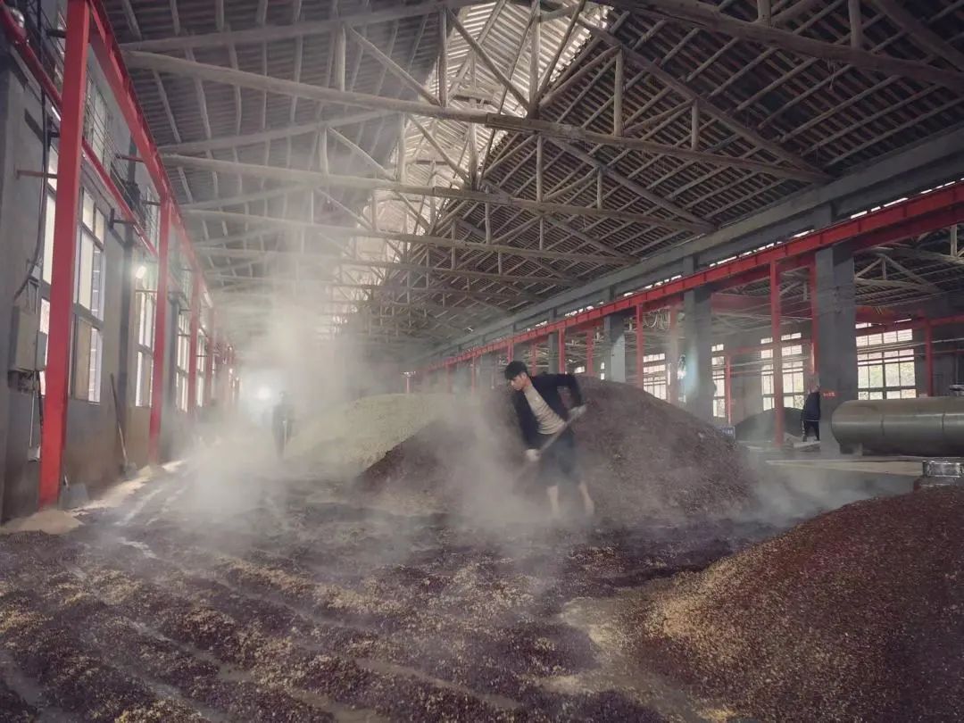 制曲时间在夏天,制曲车间里的温度经常高达40摄氏度。高温有利于微生物的生长,这些微生物混入曲块中分泌出大量的酶,可以加速淀粉、蛋白质等转化为糖分。