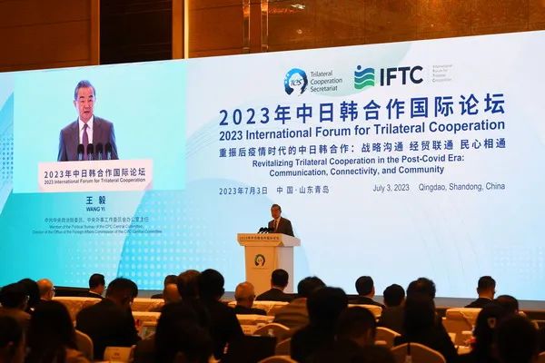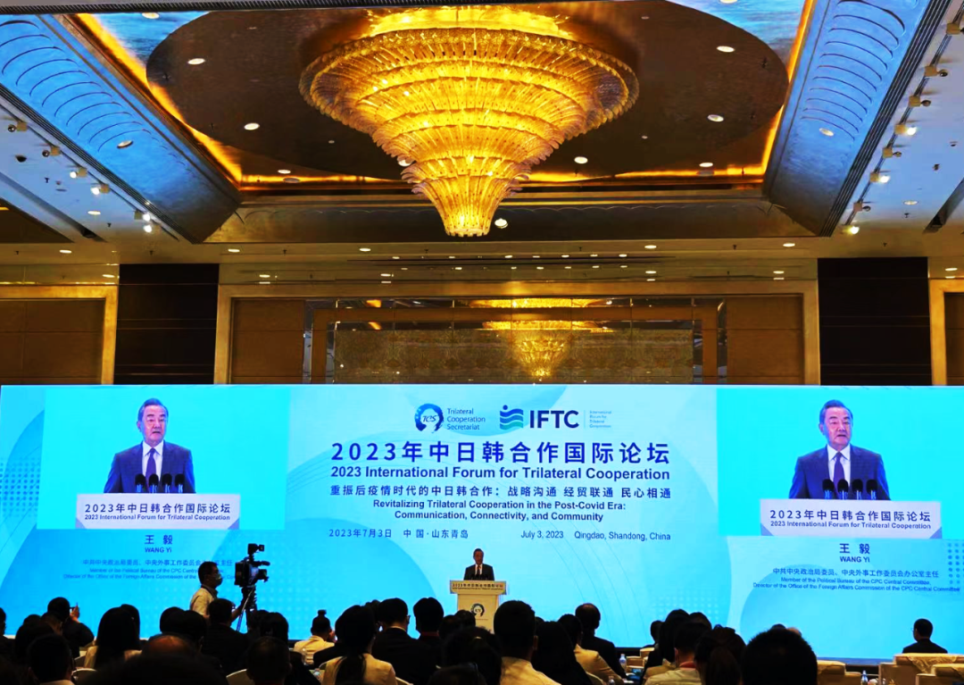7月2日至4日,由青岛市政府与中国公共外交协会、中日韩合作秘书处共同主办的中日韩合作国际论坛在山东青岛举办。中共中央政治局委员、中央外办主任王毅出席开幕式并致辞,日韩两国前政要及各界人士等350余人出席此次活动。