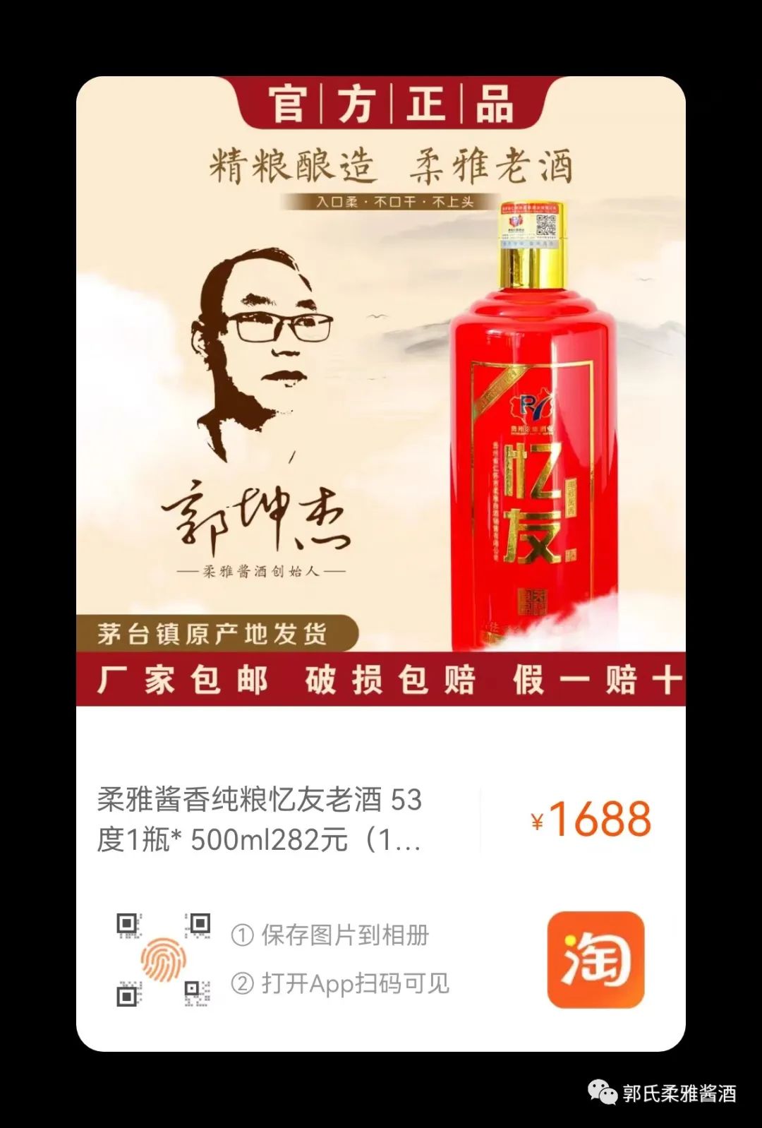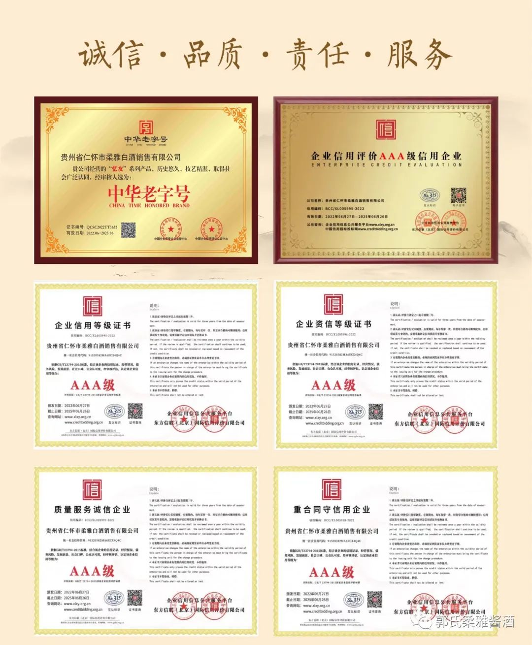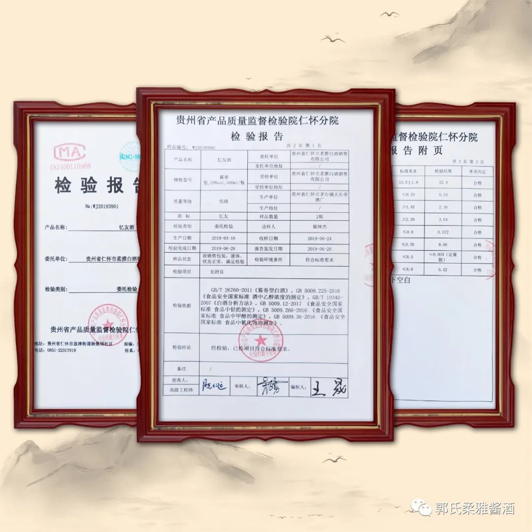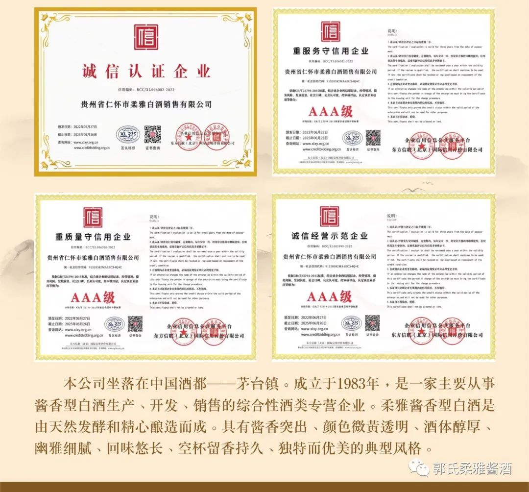 本公司坐落于中国酒都茅台古镇,是一家以郭氏柔雅酱香型白酒生产、开发和销售为一体的综合酒类专营企业。由郭坤杰先生将传统工艺与科技结合酿造而成“郭氏柔雅酱香型白酒”。以优质高粱、小麦、美酒河水为原料,采用高温大曲做糖化发酵,两次投料、九次蒸者、八次发酵、七次取酒。经高温制曲、高温堆积发酵、高温镏酒,生产周期为一年,窖藏周期五年以上,细分为酱香、醇甜、窖底香三种典型体。忆友酒具有酱香突出、颜色微黄透明、酒体醇厚、幽雅细腻、回味悠长、空杯留香持久、独特而优美的典型风格。