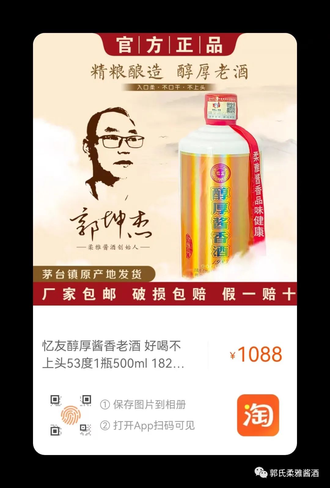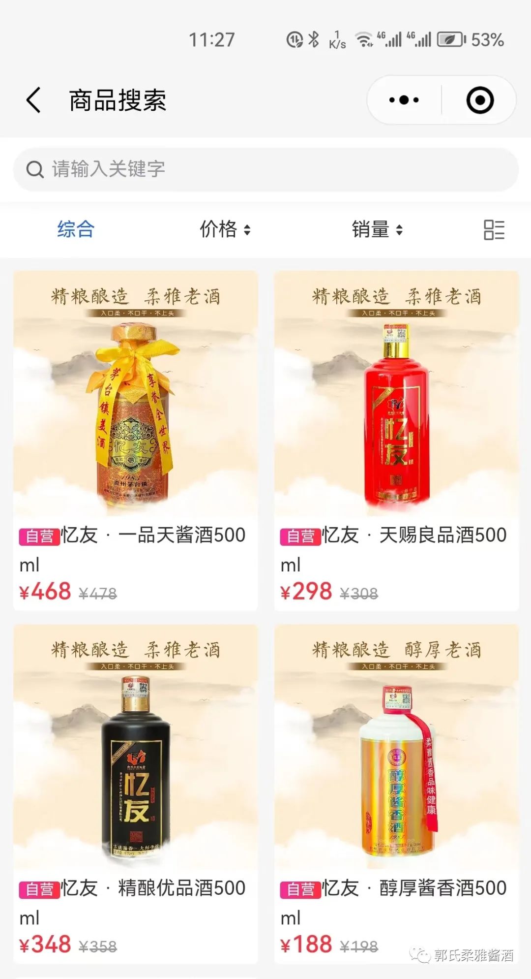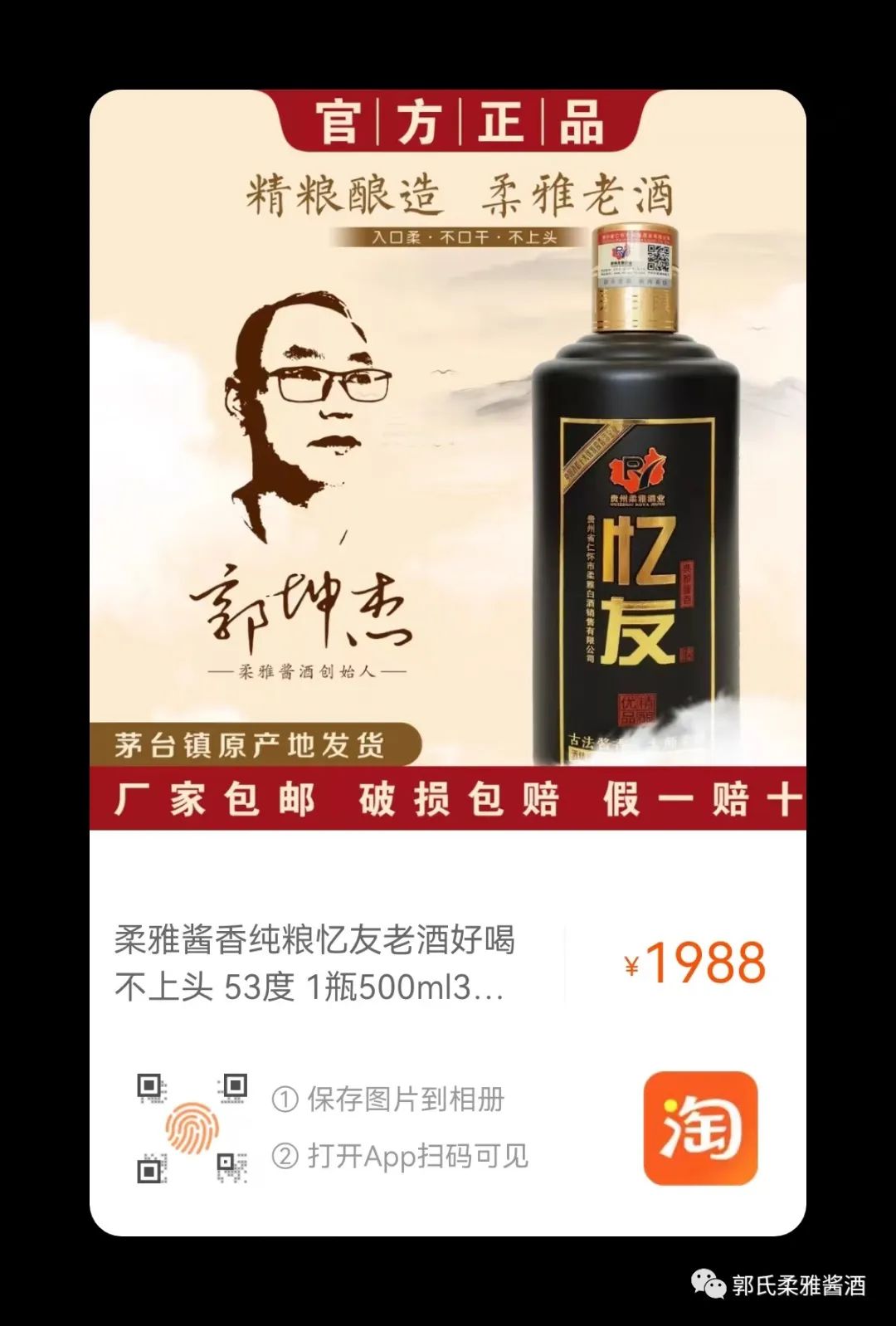 本公司坐落于中国酒都茅台古镇,是一家以郭氏柔雅酱香型白酒生产、开发和销售为一体的综合酒类专营企业。由郭坤杰先生将传统工艺与科技结合酿造而成“郭氏柔雅酱香型白酒”。以优质高粱、小麦、美酒河水为原料,采用高温大曲做糖化发酵,两次投料、九次蒸者、八次发酵、七次取酒。经高温制曲、高温堆积发酵、高温镏酒,生产周期为一年,窖藏周期五年以上,细分为酱香、醇甜、窖底香三种典型体。忆友酒具有酱香突出、颜色微黄透明、酒体醇厚、幽雅细腻、回味悠长、空杯留香持久、独特而优美的典型风格。