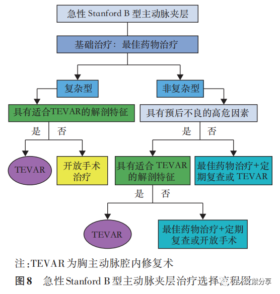 2.在药物治疗的同时,需要尽快完善评估患者的病史、临床表现、影像学和实验室检查等。根据综合评估的结果,将患者进行分类,并根据分类确定具体的治疗方案(Ⅰ类推荐,B级证据)。急性TBAD治疗选择流程图见图8。