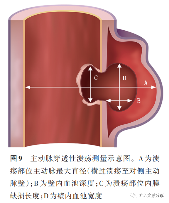(2)主动脉穿透性溃疡(penetrating aortic ulceration,PAU)治疗建议。①对于破裂的PAU患者,建议急诊手术修复(Ⅰ类推荐,B级证据)。②对于主动脉弓或胸降主动脉PAU合并相关IMH的患者,紧急手术修复是合理的(Ⅱa类推荐,C级证据)。③对于腹主动脉PAU合并IMH的患者,可考虑紧急手术修复(Ⅱb类推荐,C级证据)。④对于具有临床症状和持续性疼痛且与影像学表现相关联的孤立性PAU患者,建议手术修复(Ⅰ类推荐,B级证据)。⑤对于没有临床症状但具有高危影像学特征的孤立性PAU患者,可建议选择性手术修复(Ⅱb类推荐,C级证据)。高危影像学特征包括:PAU最大直径>20 mm;PAU最大深度>10 mm;PAU深度或直径明显增大;PAU伴有囊状动脉瘤;PAU伴随胸腔积液增多。PAU测量方法见图9。⑥位于远端主动脉弓(2~3区)、胸降主动脉或腹主动脉需要手术修复的PAU患者,选择外科还是腔内修复取决于解剖条件和合并症(Ⅱa类推荐,C级证据)。