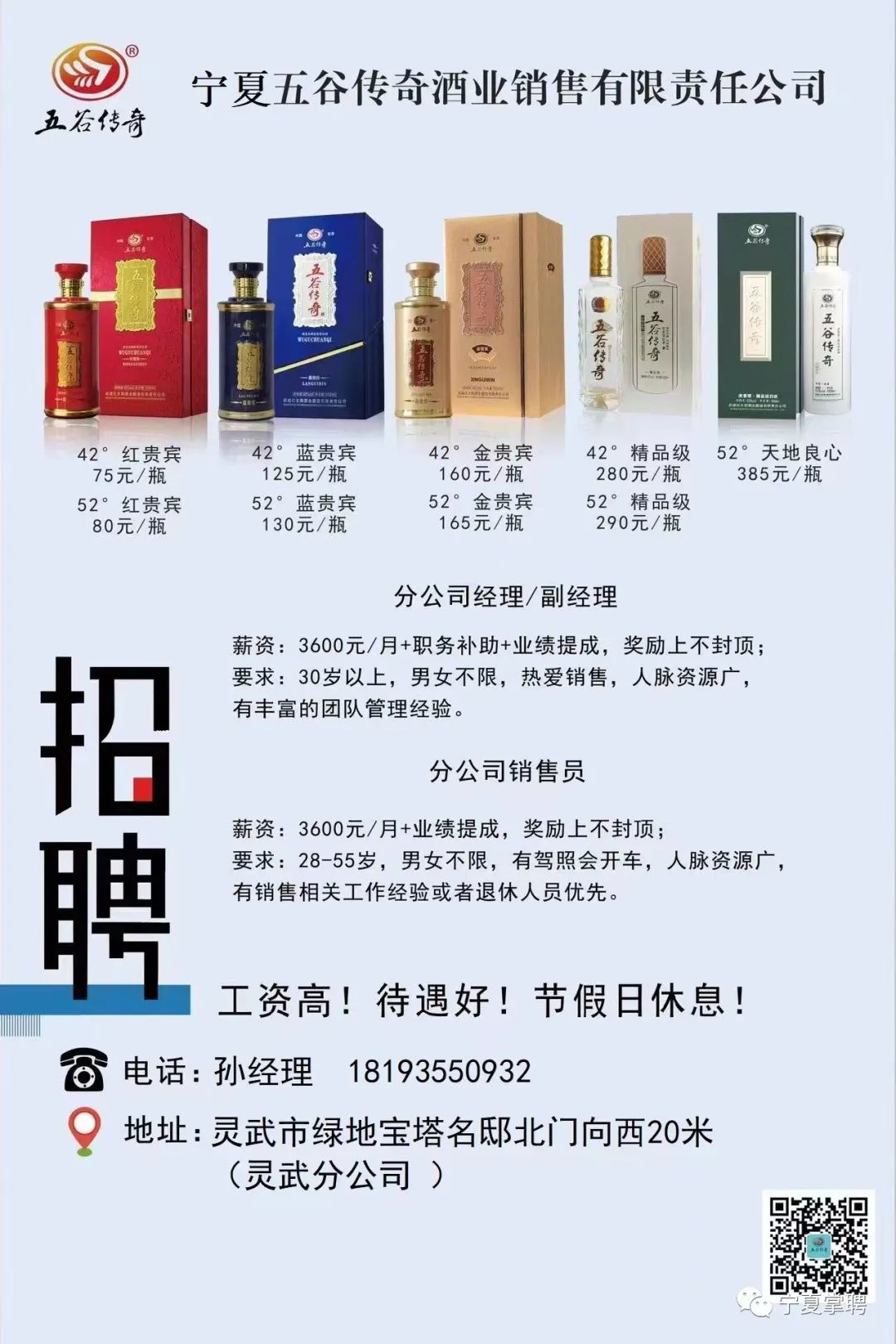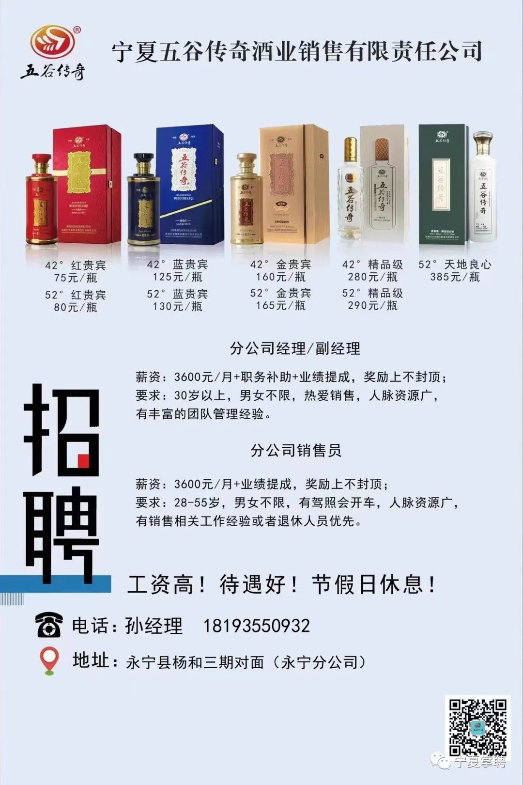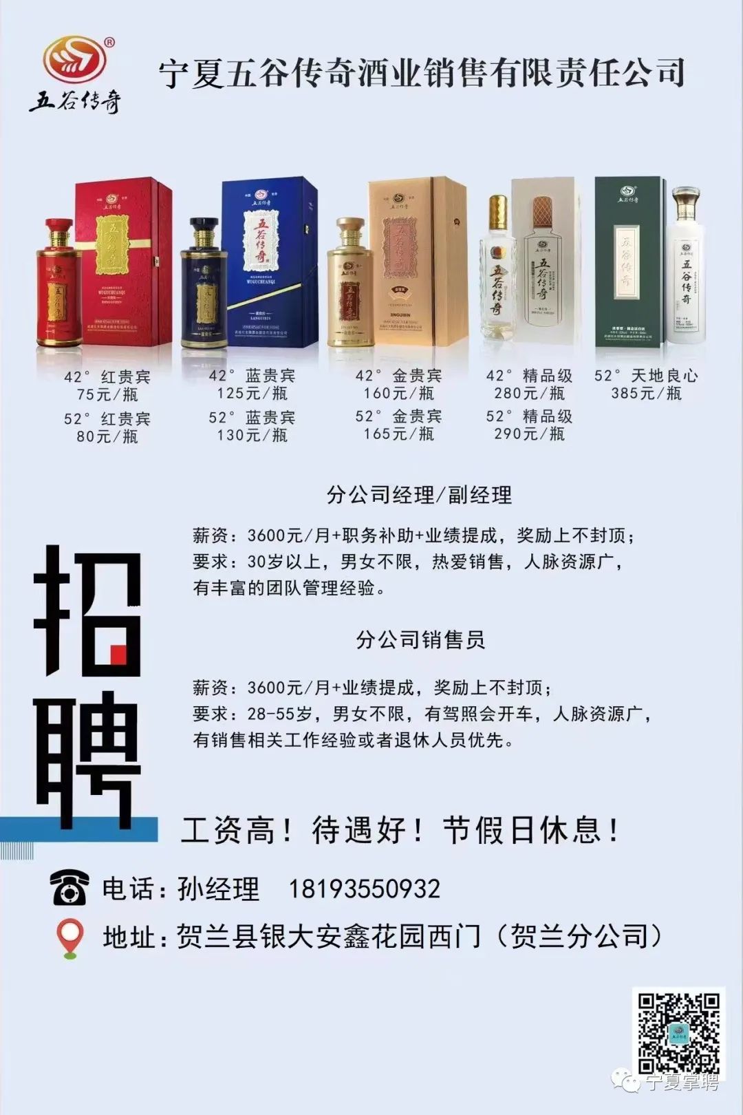 宁夏五谷传奇酒业销售有限责任公司永宁、贺兰、灵武三家分公司都在招人