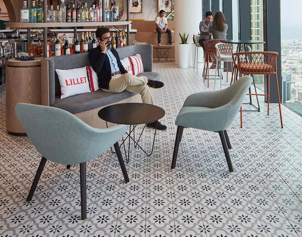 “创享欢聚”共享欢乐时光,是前台休闲咖啡吧的设计灵感,充足的自然光照和壮观的城市景观视野,让这里成为访客和员工在此逗留、感受品牌文化、并彼此真诚分享的地方。这处咖啡休闲区采用定制的天花设计、经典的小花砖、并配置了舒适的吧椅和休闲座椅、以及阶梯座,成为该办公室重要的社交空间。