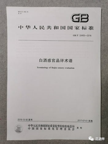 这种规范的具体表现形式就是,形成了中华人民共和国国家标准GB/T 33405—2016《白酒感官品评术语》。
