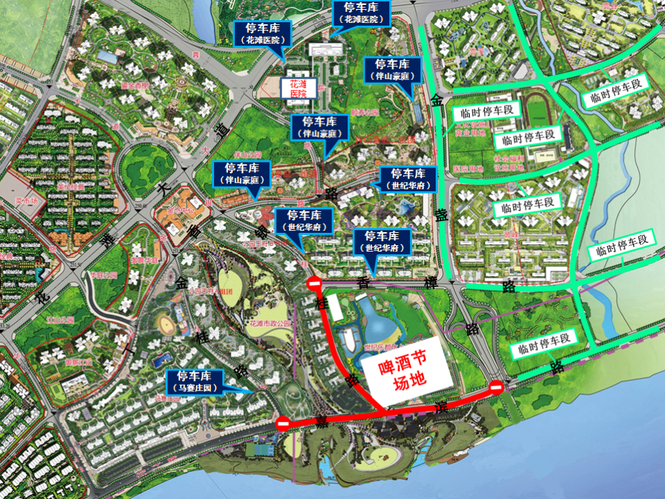 前往或途经啤酒节现场车辆,可经北环路—花滩大道—金盏路,或者嘉滨路—丁香路—金盏路通行。