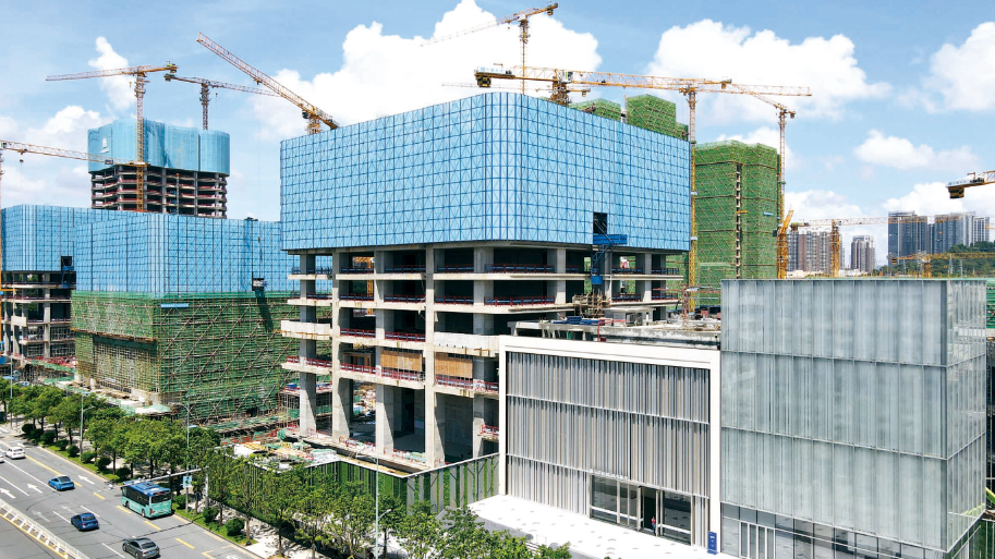 从2021年8月华润雪花科创城在宝安正式动工,不到两年时间,项目的润智研发中心(智造厂房)已封顶,主体部分雪花科创大厦等五六栋建筑也已“长”出地面十几米,并不断向上“生长”,施工现场一片火热。