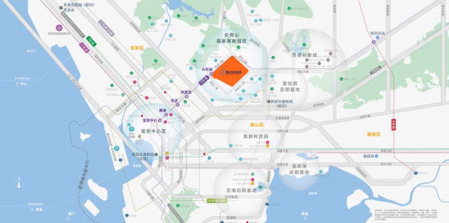 南侧有腾讯岛未来科技城、中间有宝安中心区