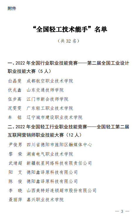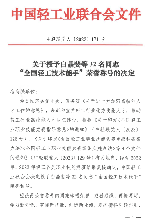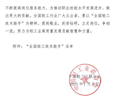 编者按:5月20-21日,由中国财贸轻纺烟草工会、中国轻工业联合会、中国酒业协会联合主办,浙江省财贸工会、丽水市总工会、青田县人民政府共同承办,青田县总工会等单位协办的2023年中国葡萄酒品酒师技能大赛决赛在浙江青田成功举办。根据大赛表彰奖励办法,在决赛中获得第一名且符合推荐条件的选手,将报请中华全国总工会授予“全国五一劳动奖章”;获得第一名至第十五名且符合推荐条件的选手,将由组委会授予“全国轻工行业技术能手”。7月5日,中国轻工业联合会发布《关于授予白晶斐等32名同志“全国轻工技术能手”荣誉称号的决定》。2023年中国葡萄酒品酒师技能大赛前15名选手获得“全国轻工技术能手”称号。