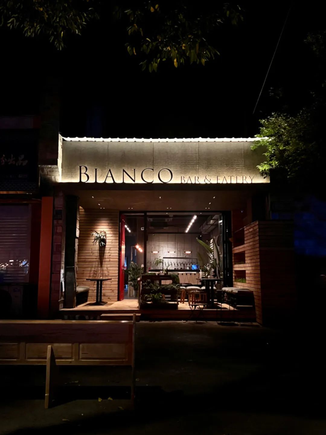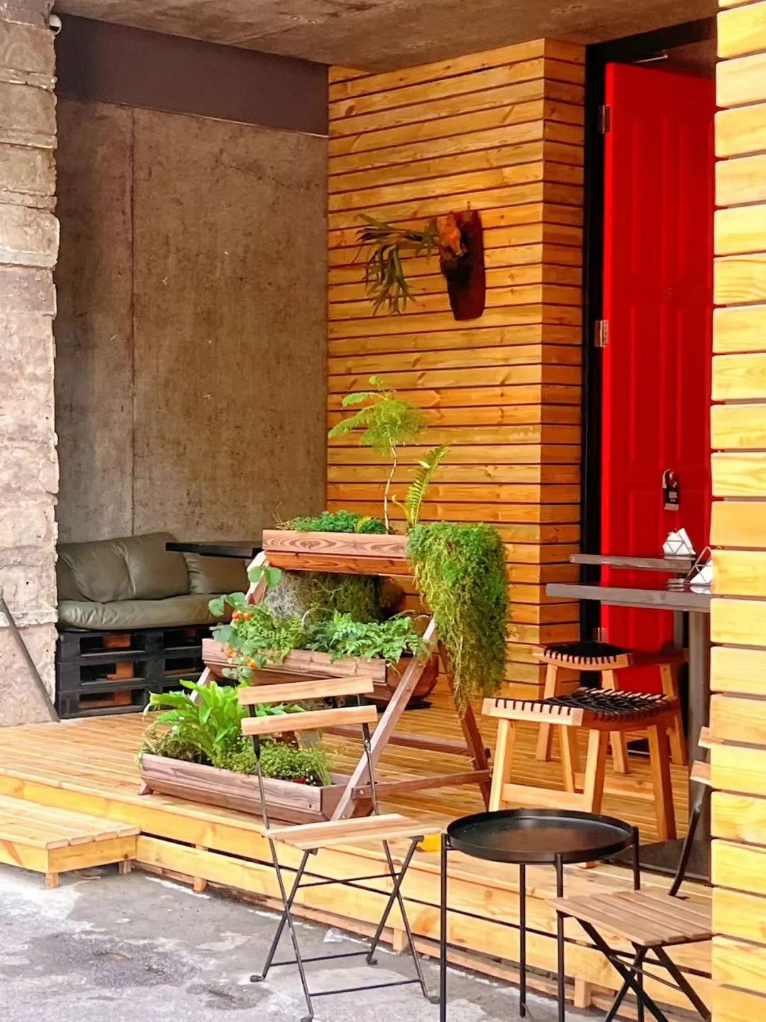 这家餐酒吧小街巷临街,红色的门头显眼又好看,外摆区各种绿植围绕,傍晚时刻特别舒适。