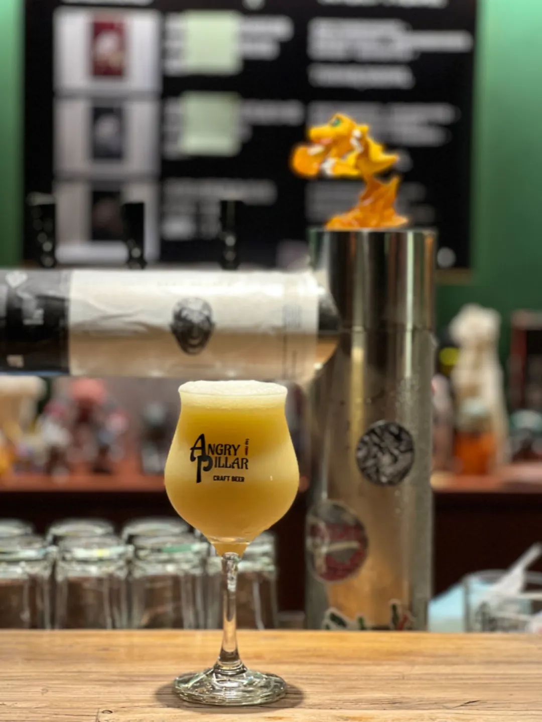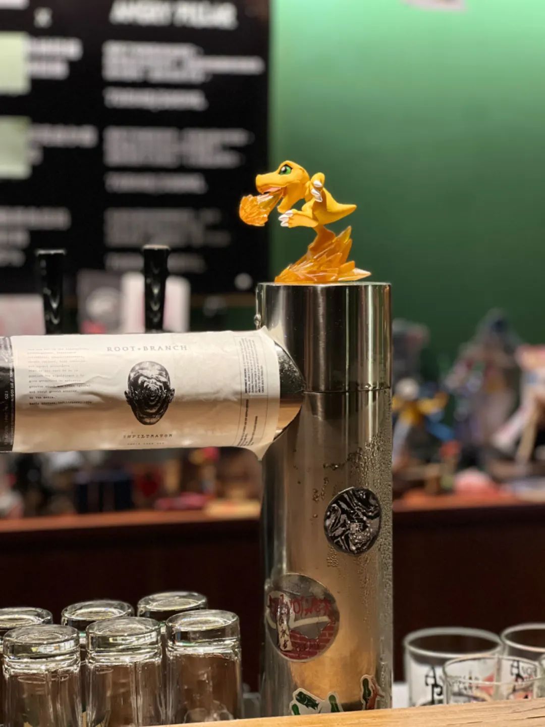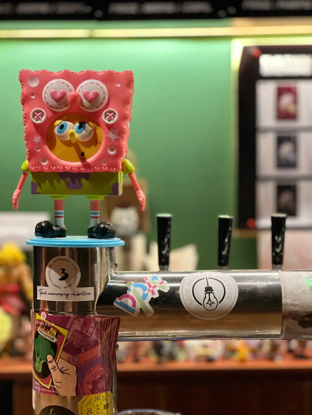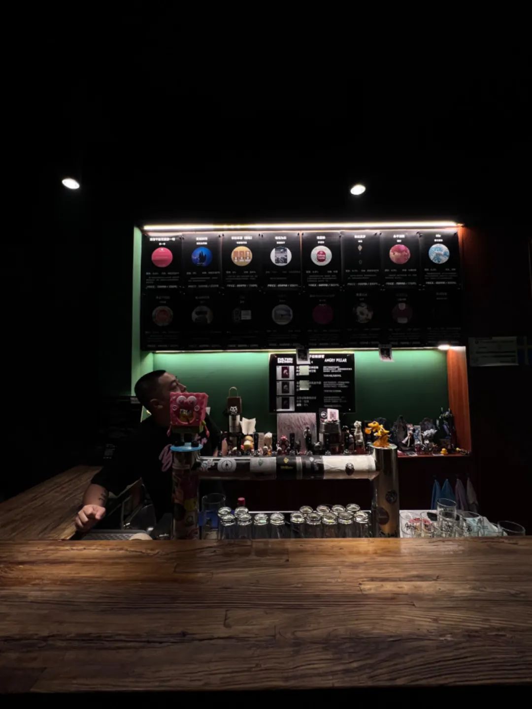 在柱子的酒杯上印着“生命短暂,别瞎X喝”,盲猜老板也是有态度的摇滚青(中)年,但吧台上的海绵宝宝、小火龙又把中二气息暴露了。