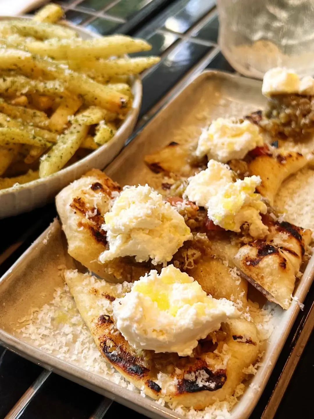 餐食主打意大利菜,我们以一瓶白葡萄酒开局,强推手工瑞塔克和烟熏茄子饼、西西里小奶卷,还有麻婆豆腐盖浇薯条、四川腊肠二荆条披萨也很有意思,chef玩的就是一个融合又不突兀,食材和味道样样都在线!