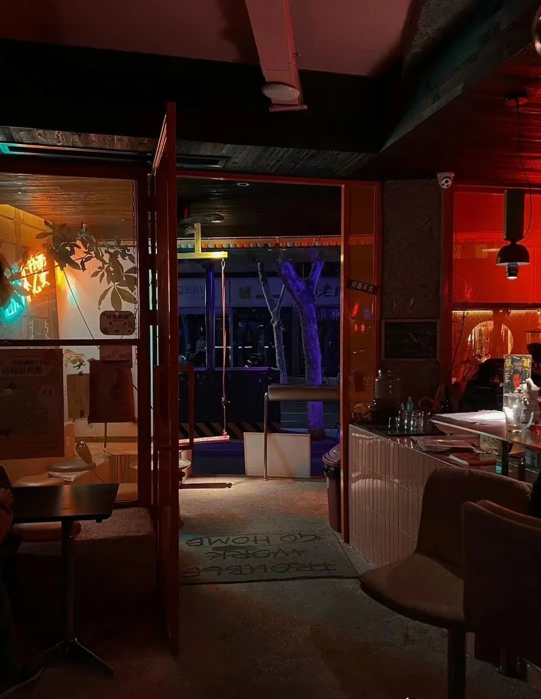 外摆区有一个秋千和零星的座位,夜深了认识或不认识的人凑在一起,很自然就能摆上龙门阵,话最密的可能是店老板,聊投机了大家还要加微信。当然,通常这时候,每个人都端着一杯酒。