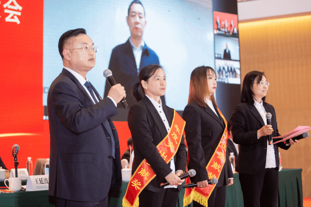 与“海外突出贡献奖”获奖者李宽平、谢永东在现场视频连线,并为两位家属代表颁奖,全场以热烈掌声向公司海外员工及家属致敬。
