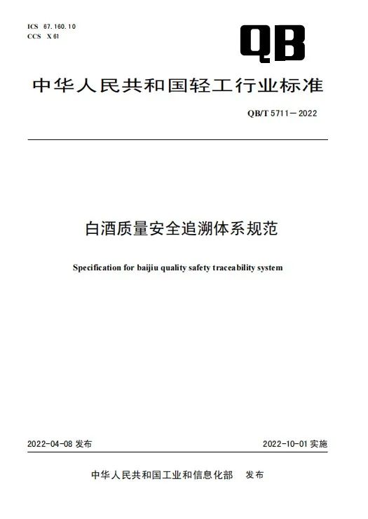 2022年4月24日,第22个“世界知识产权日”前夕,中华人民共和国工业和信息化部发布公告(2022年第10号),正式发布《白酒质量安全追溯体系规范》(QB/T 5711-2022)行业标准。标准实施日期为2022年10月1日。该标准适用于我国白酒生产、销售企业开展质量追溯体系建设与管理。