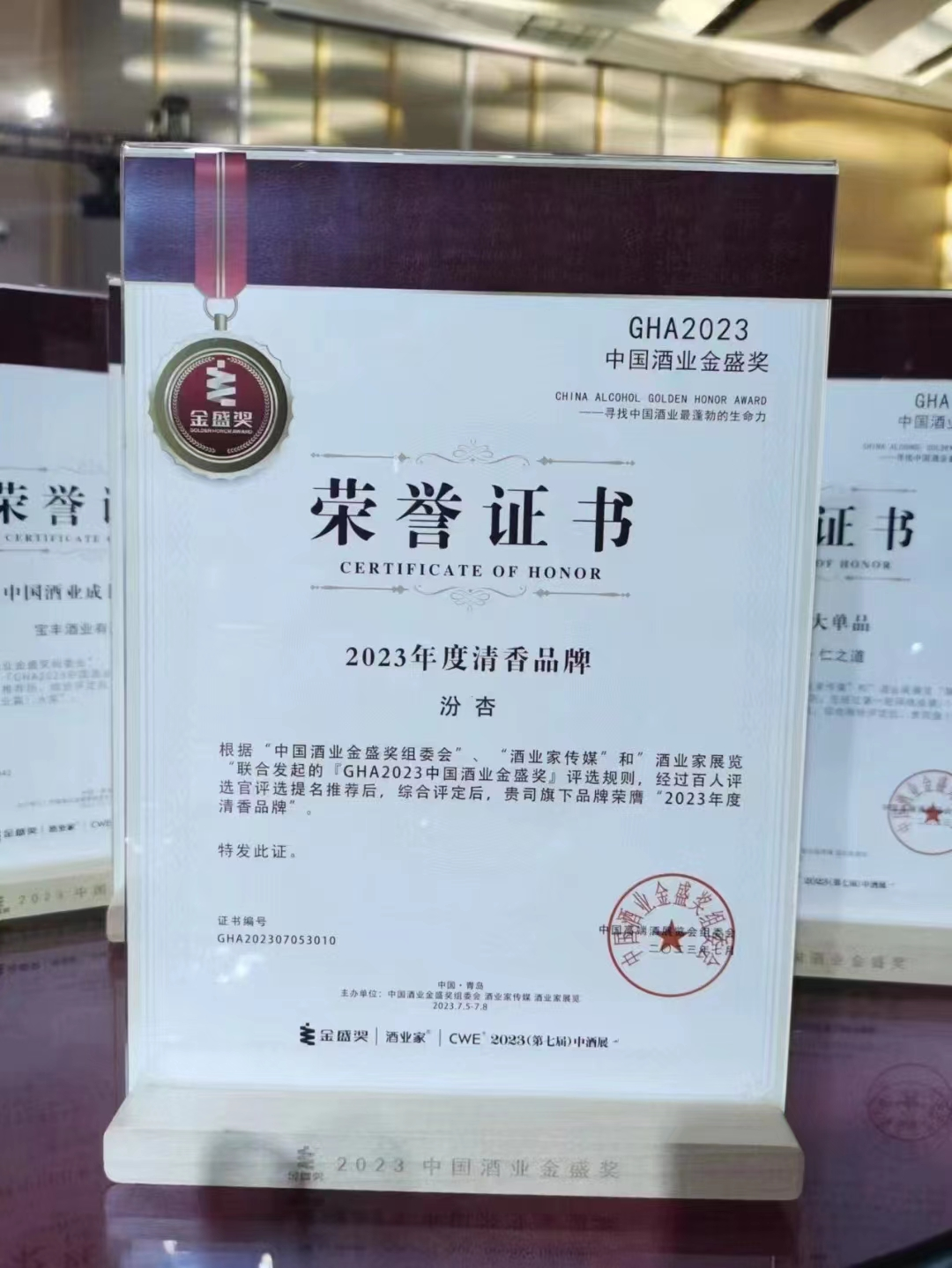 汾杏和青花汾杏分别斩获2023年中国酒业金盛奖和好产品荣誉称号