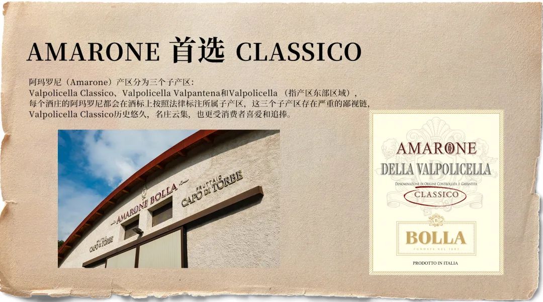 阿玛罗尼(Amarone)产区分为三个子产区:Valpolicella Classico、Valpolicella Valpantena和Valpolicella (指产区东部区域),每个酒庄的阿玛罗尼都会在酒标上按照法律标注所属子产区,这三个子产区存在严重的鄙视链,Valpolicella Classico历史悠久,名庄云集,也更受消费者喜爱和追捧。