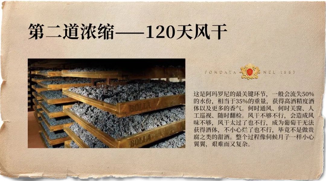 葡萄园中完全成熟的葡萄,只有30%最优质的葡萄会被手工精选出来,放进风干阁楼进行浓缩操作,等到120天风干完成后,再次人工精选合格的葡萄用来酿造阿玛罗尼,遇到不好的年份,会取消阿玛罗尼的酿造计划。