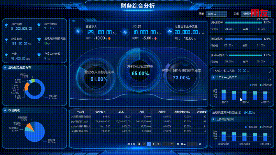 财务主题分析包含了食品饮料行业的常用指标,如营业利润、税前利润、经营性现金流、资产规模、资产负债率、应收账款、存货、流动比率、主要客户收入占比、主要供应商采购占比等。领导层通过直观的经营指标数据与应收和库存数据能够及时进行全局的把控与决策的调整。