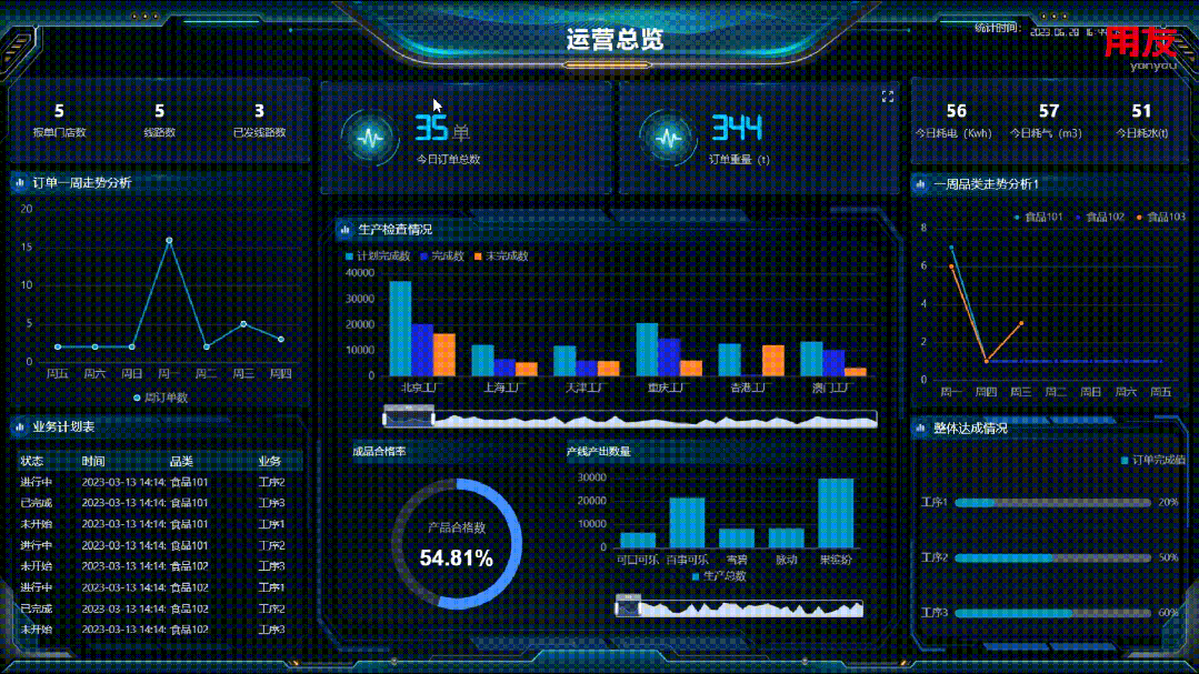 展示食品行业在计划、生产、质量、物流、交付、效率等方面的相关数据和趋势,起到可视化管理的作用,旨在协助管理人员整体掌控运营的实时实景,及早发现业务卡点,及时解决问题,优化运营,为管理人员提供决策支持。
