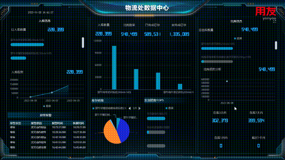 监控全局物流情况,通过出入库情况及趋势分析,评估物流健康度,全景物流分析,异常情况及时预警,提高物流效率。