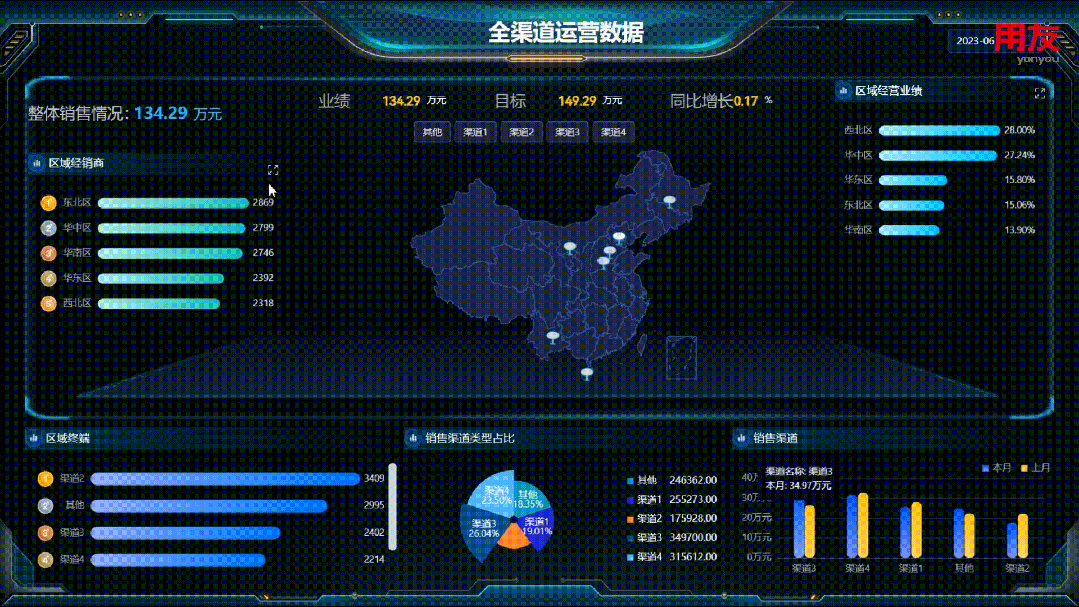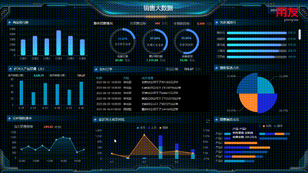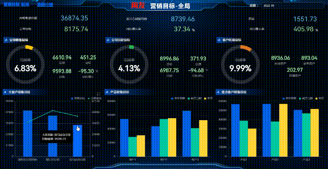 从总部经营视角把握企业经营目标完成情况,围绕着营销区域、客户销售、回款、销售收入增长、产品铺市率等关键指标,快速识别问题,及时调整销售策略。