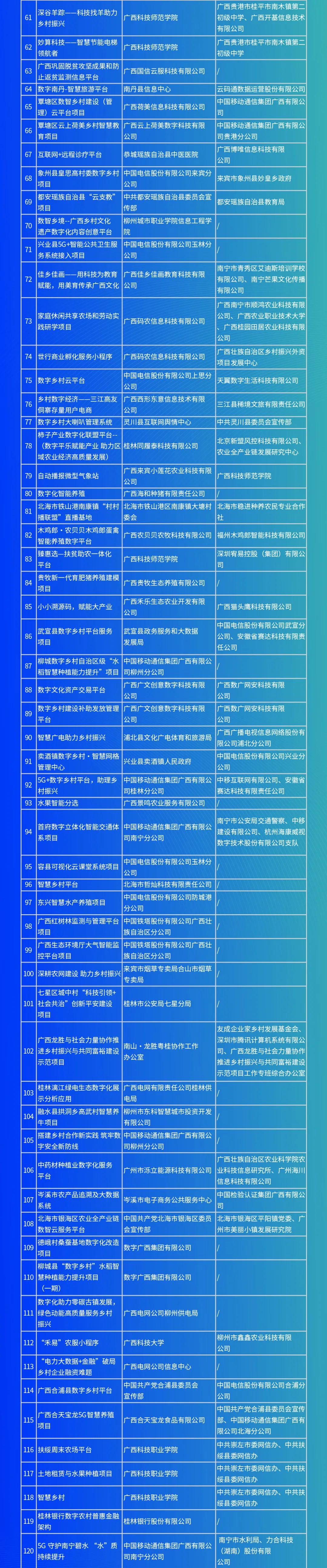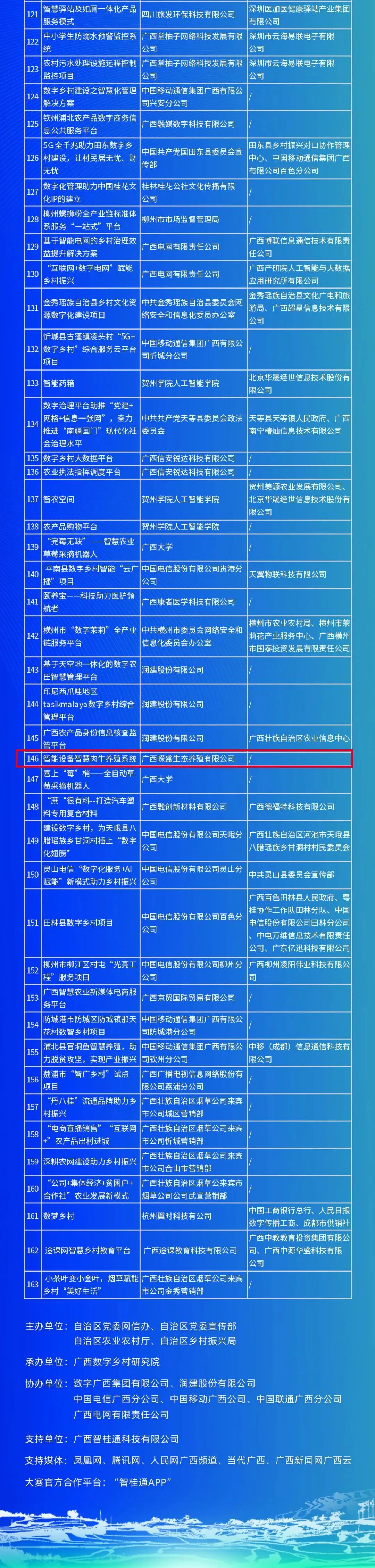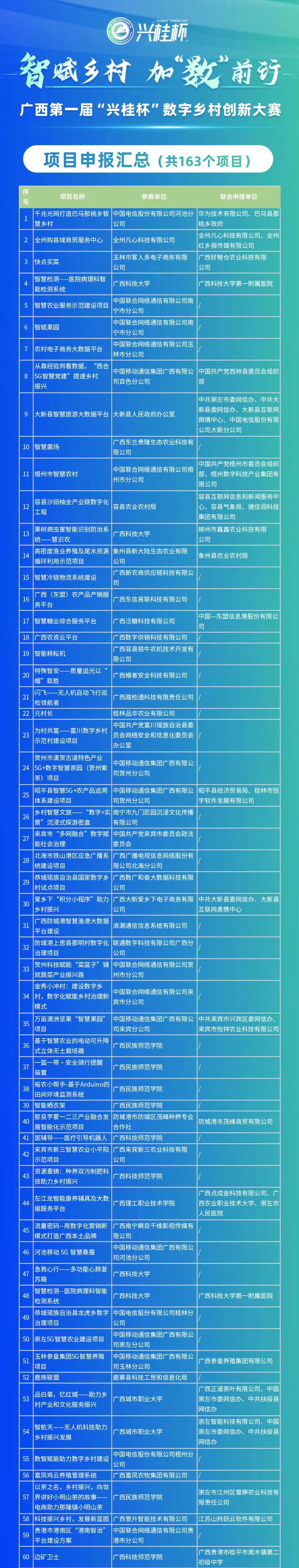 广西第一届“兴桂杯”数字乡村创新大赛由自治区党委网信办联合自治区党委宣传部、自治区农业农村厅、自治区乡村振兴局共同主办,由广西数字乡村研究院承办,数字广西集团有限公司、润建股份有限公司、中国电信广西分公司、中国移动广西公司、中国联通广西分公司、广西电网有限责任公司一起协办。本次大赛于5月12日正式启动,随后进入案例征集环节,现将大赛报名情况予以公示。