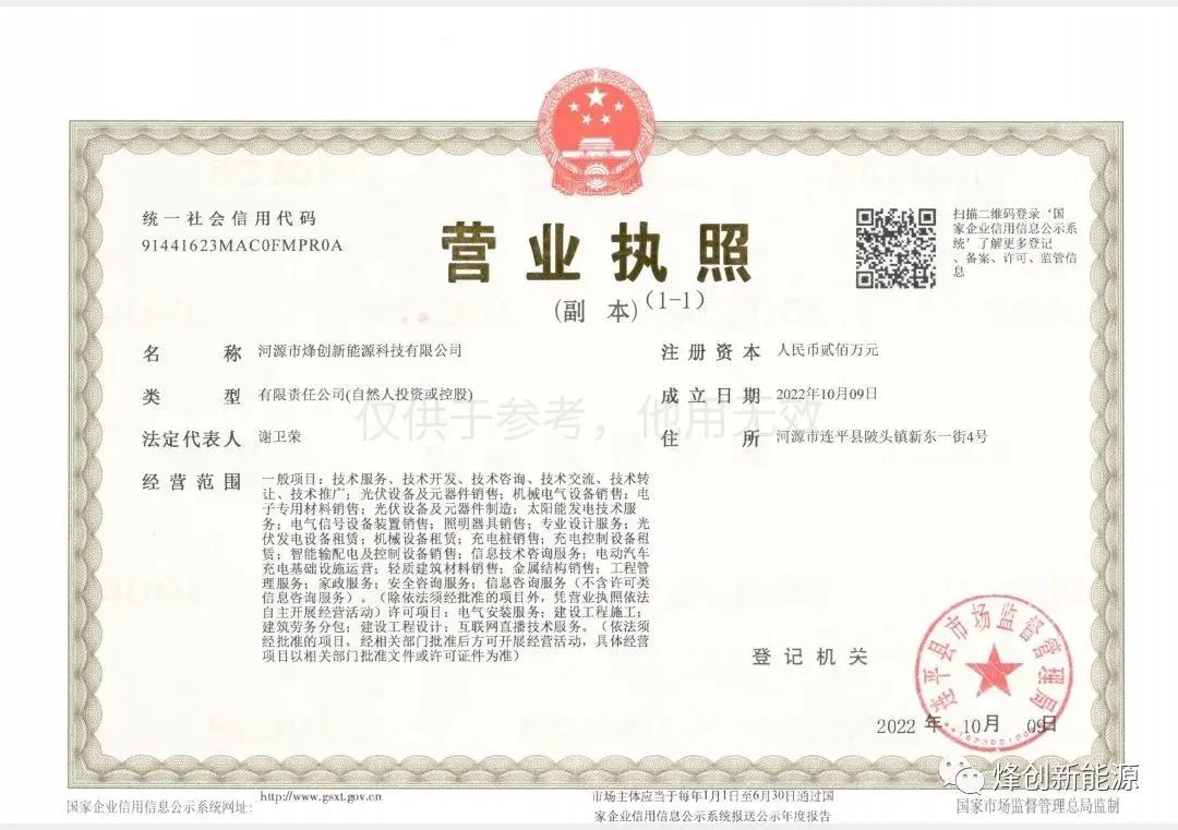 烽创新能源是河源市致力于光伏电站系统集成的安装商,公司涵盖光伏设备销售、设计施工安装、售后运营维护等业务、销售光伏组件、逆变器、并网箱、光伏支架、线缆、电站防水等设备材料;