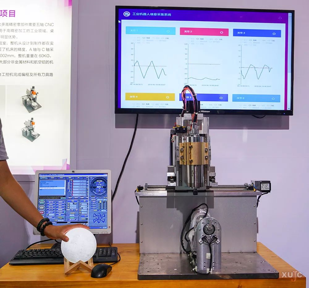 体积小巧,却能进行复杂零件加工,在交易会上,这台由机电工程学院2014级学子梁淯贤独立设计的桌面五轴CNC设备引起了不少人的兴趣。不同于大型五轴CNC,桌面五轴CNC在小型、微型复杂零件加工中具有明显优势。“能够完成大部分非金属材料和航空铝的机械加工”,说起自己的作品,梁淯贤有点小成就感,“大二的暑假,我曾经做了一台三轴CNC,后来在指导老师的鼓励下,我决定在毕业设计时去挑战一下五轴CNC。”虽然设计出来的设备受到了认可,但梁淯贤的探索并没有止步,“还有许多需要改进的地方,我会重新出图纸,对机器进行改进”。