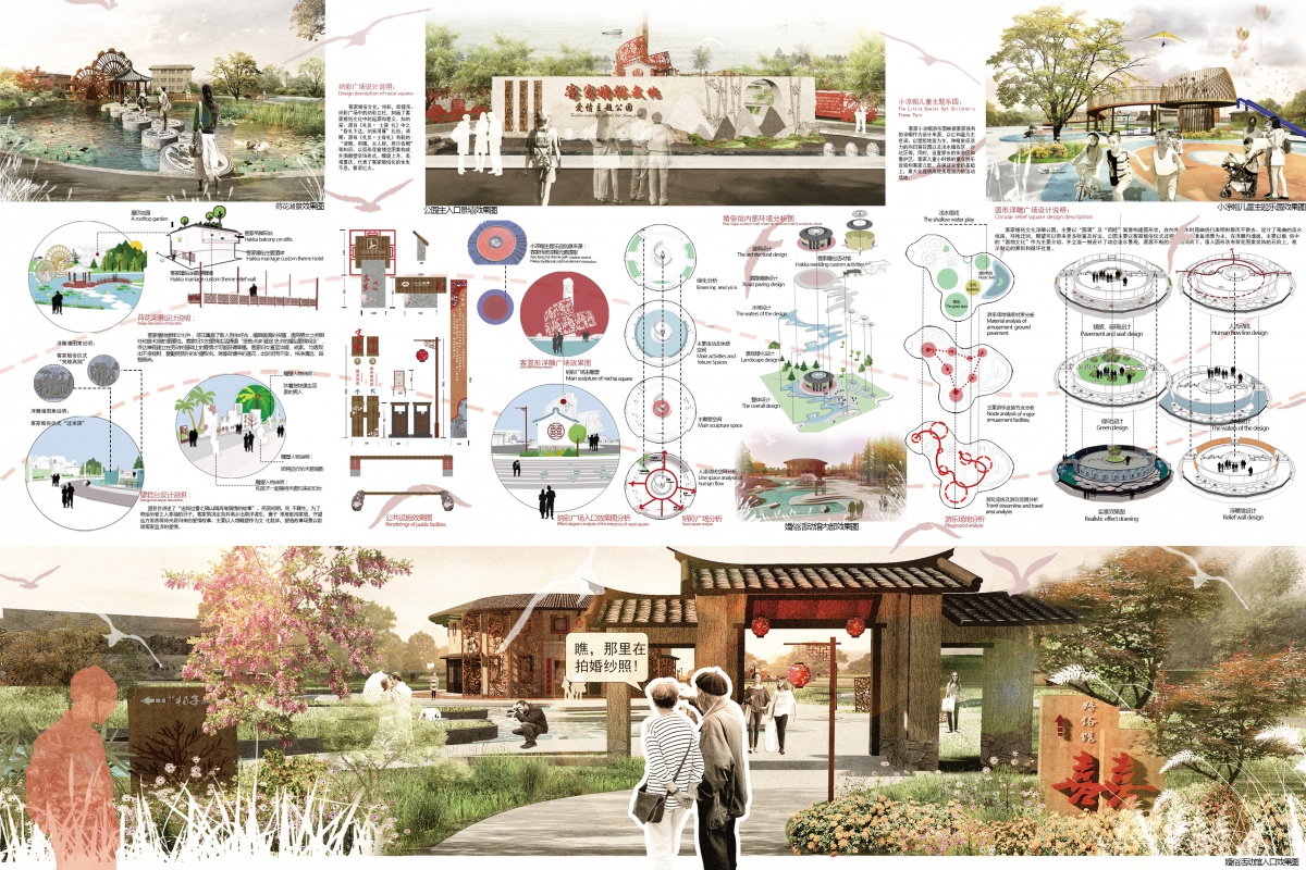 纳彩广场中的纳彩立柱,刻画了客家婚俗文化中的起源和意义。如纳采:源自《礼仪• 士昏 礼》中之:“昏礼下达,纳釆用雁”礼俗等知识。以弧形花窗镂空图案构成外围雕塑装饰形式,螺旋上升,美观喜庆,代表了客家婚俗文化的生生不息,繁荣红火。入口浮雕墙以客家建筑和自然相融合场的场景为背景,配合客家山脉简形和、毛竹、窗棂作为设计元素、将其融合重新构成完整浮雕景墙。周边以水环绕之,象征了客家人的临水而居及与大自然和谐共生的紧密联系。5、小凉帽儿童主题乐园效果图:客家小凉帽游乐园根据客家独有的凉帽作为设计来源,以红和蓝为主色调,以塑胶地面为主,种植象征活力的向日葵花园以及浅水嬉戏区、沙坑区等,同时,设置家长的休息区和看护区、客家儿童小时候的童年游乐设施和客家儿歌,在保证安全的基础上,最大化提供高效美观活力的活动场地。6、圆形浮雕广场效果图:客家婚俗文化浮雕公园,主要以“圆满”及“荷睦”寓意构建圆形状,在向外排水时屈曲绕行表明财聚而不散去。设计了弯曲的流水线路,环抱迂回,期望可以带来更多财富及好运。公园主要以客家婚俗仪式过程中的忙碌准备场景为主,在浮雕内墙面,主要以婚 俗中的“器物文化”作为主要介绍。外立面一侧设计了动态流水景观,源源不断的水流倾泻而下,落入圆形状有荷花图案装饰的石阶上,表示财运的累积和循环往复。