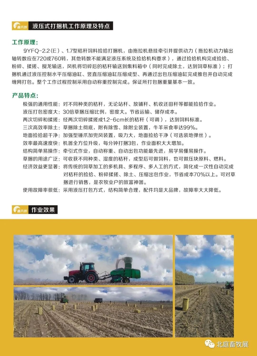 目前开发的新产品有固定式秸秆饲料生产线、移动式秸秆饲料生产线、牵引式圆捆秸秆饲料打捆机、牵引式大方捆打捆机、丘陵山区玉米收获机和丘陵山区大豆收获机等产品。