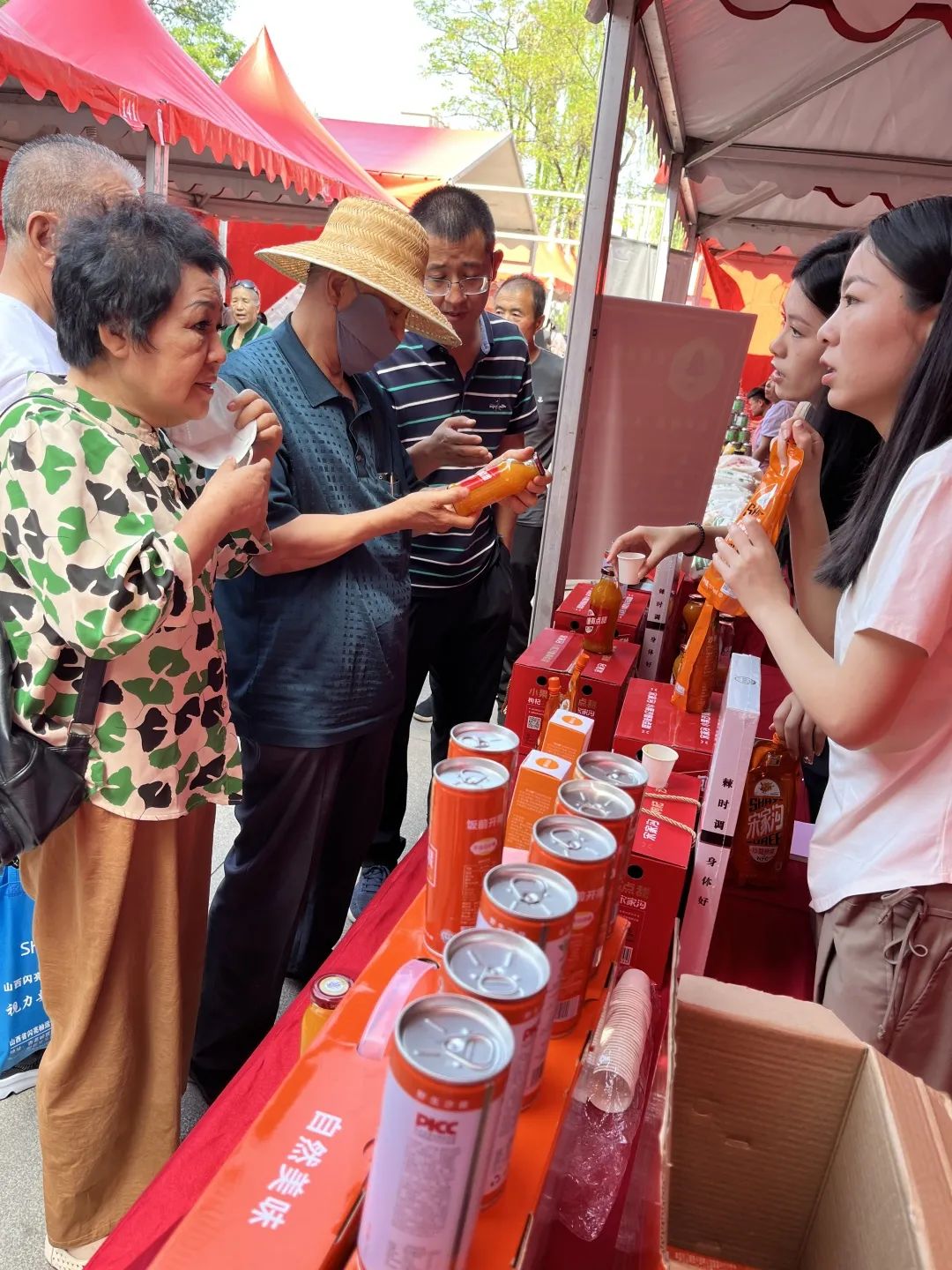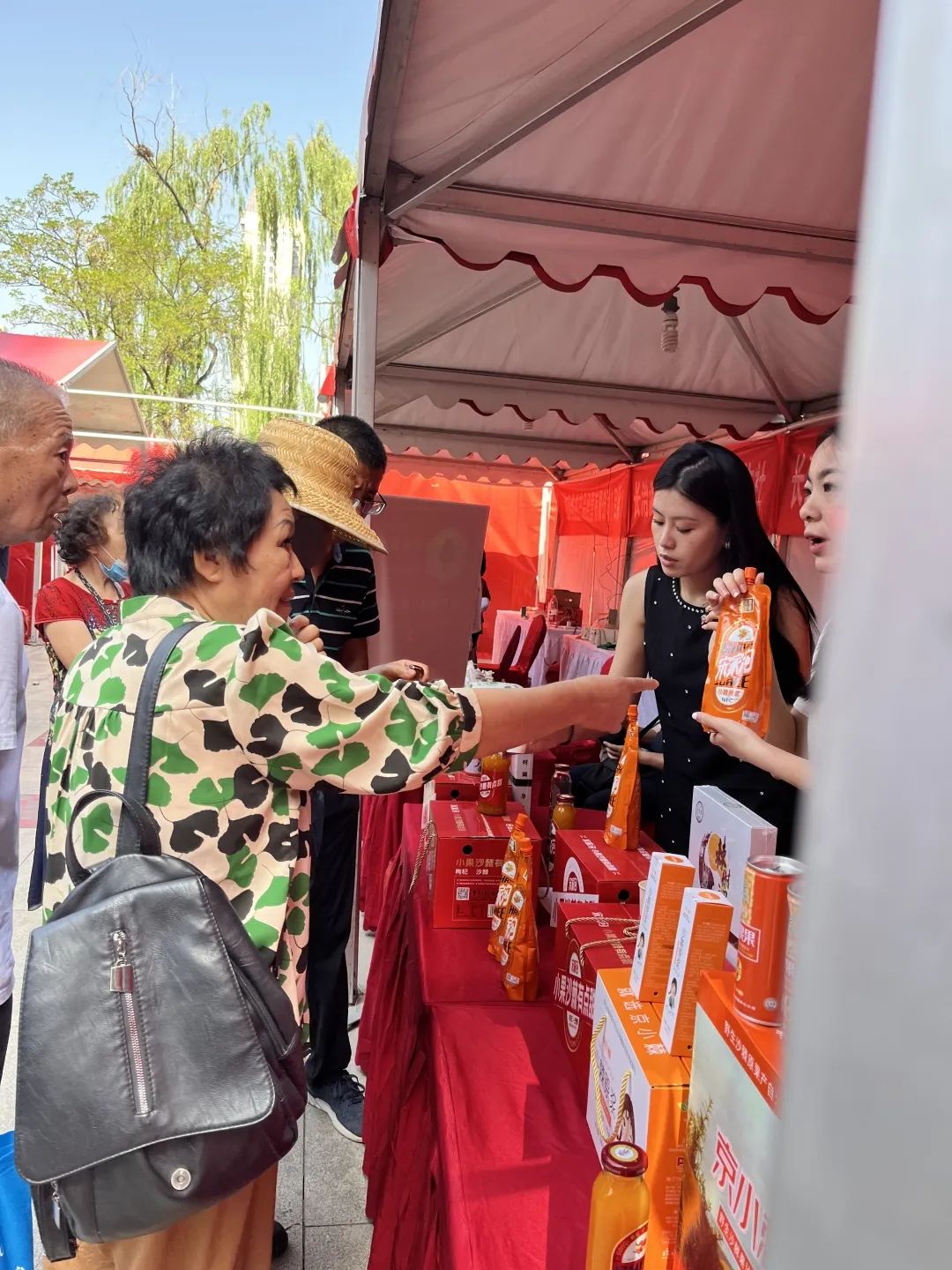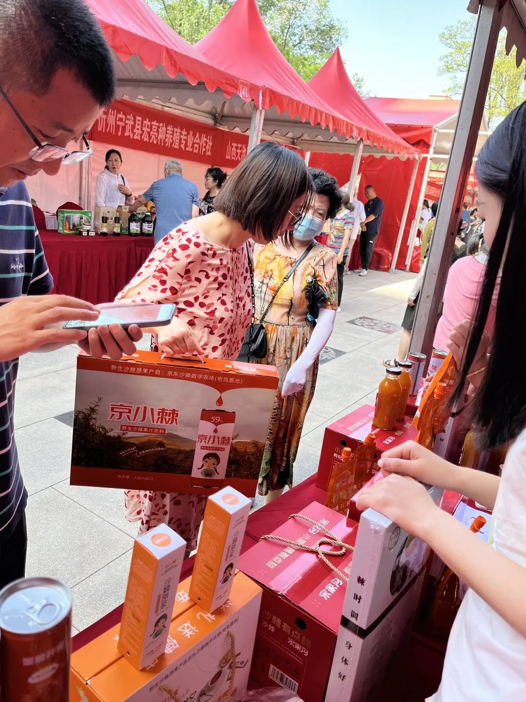现场吸引了众多沙棘爱好者的围观,我们也进行了免费试喝的活动。现场工作人员正在讲解沙棘的知识和产品介绍。